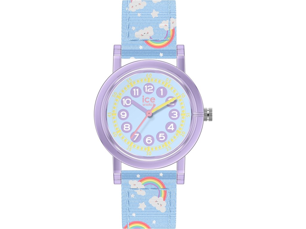 A dial with large numerals and colour-coded hours and minutes makes learning the time easy. The compact 28 mm size is ideal for smaller children's wrists. The purple plastic case is complemented by a light blue nylon strap with a cheerful rainbow motif.