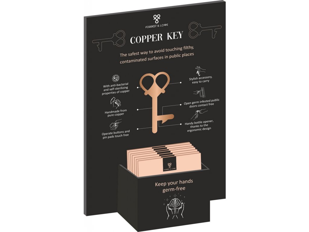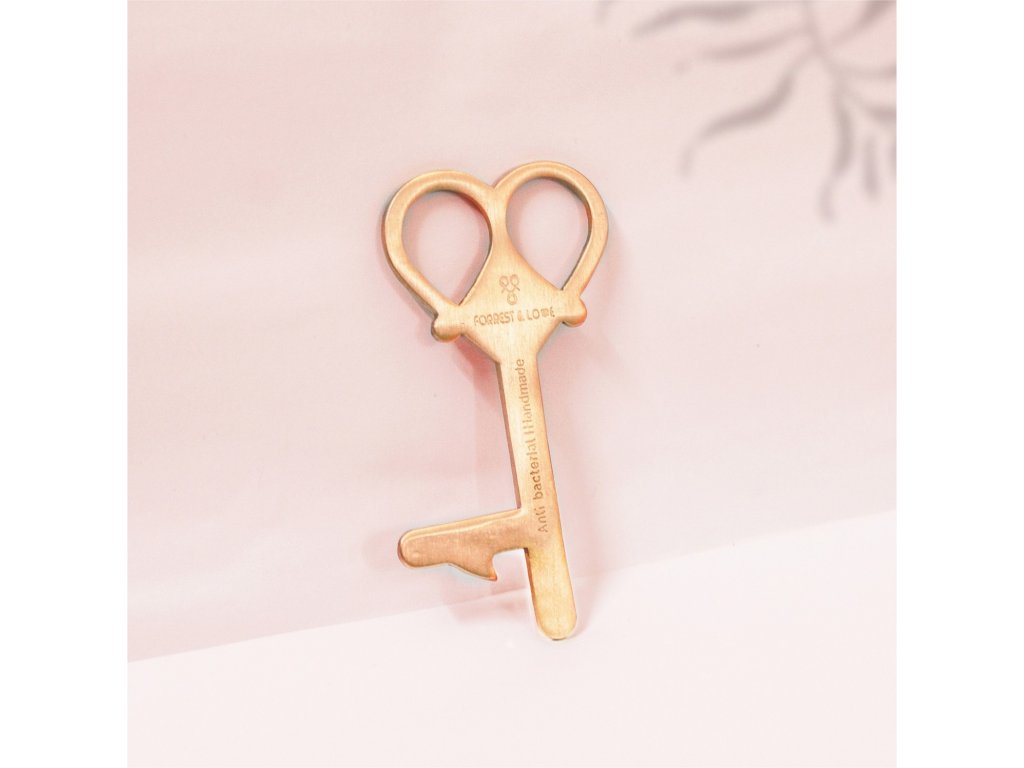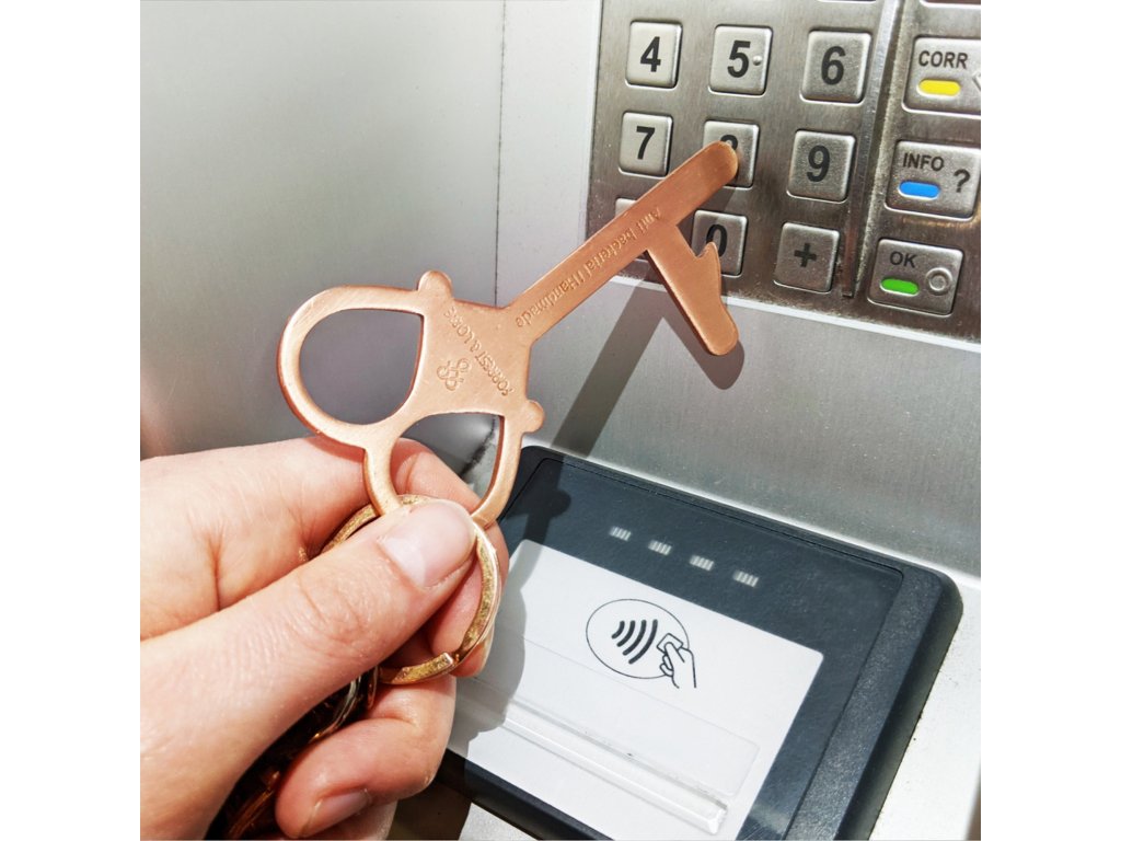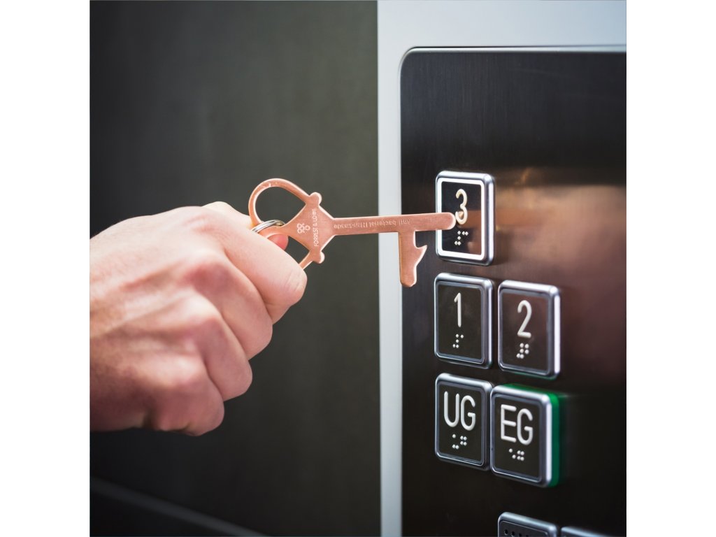 The copper key is ideal for you and surfaces in public areas - for example, elevator call buttons or ATM keypads. It also functions as a bottle opener and can be used to open doors. Thanks to the copper key, all contaminated areas become contactless for you. And the dirt stays out of the way!