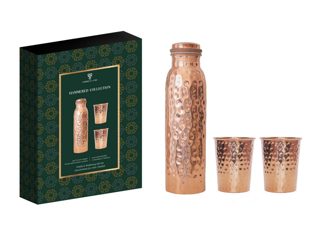 Make drinking ordinary water an extraordinary experience and get yourself or your loved ones a set of bottles and cups, unconventionally made of copper. Copper is a noble metal which, according to Ayurveda, has a healing effect on the human body.