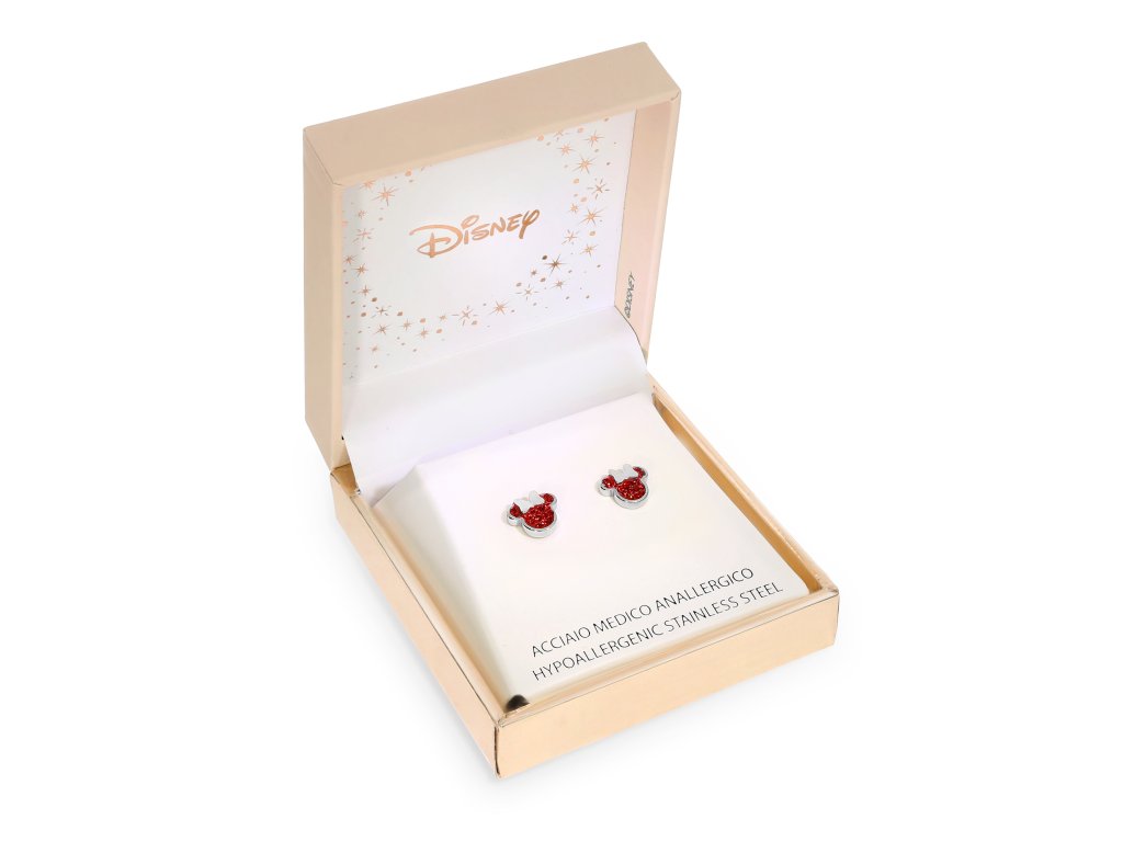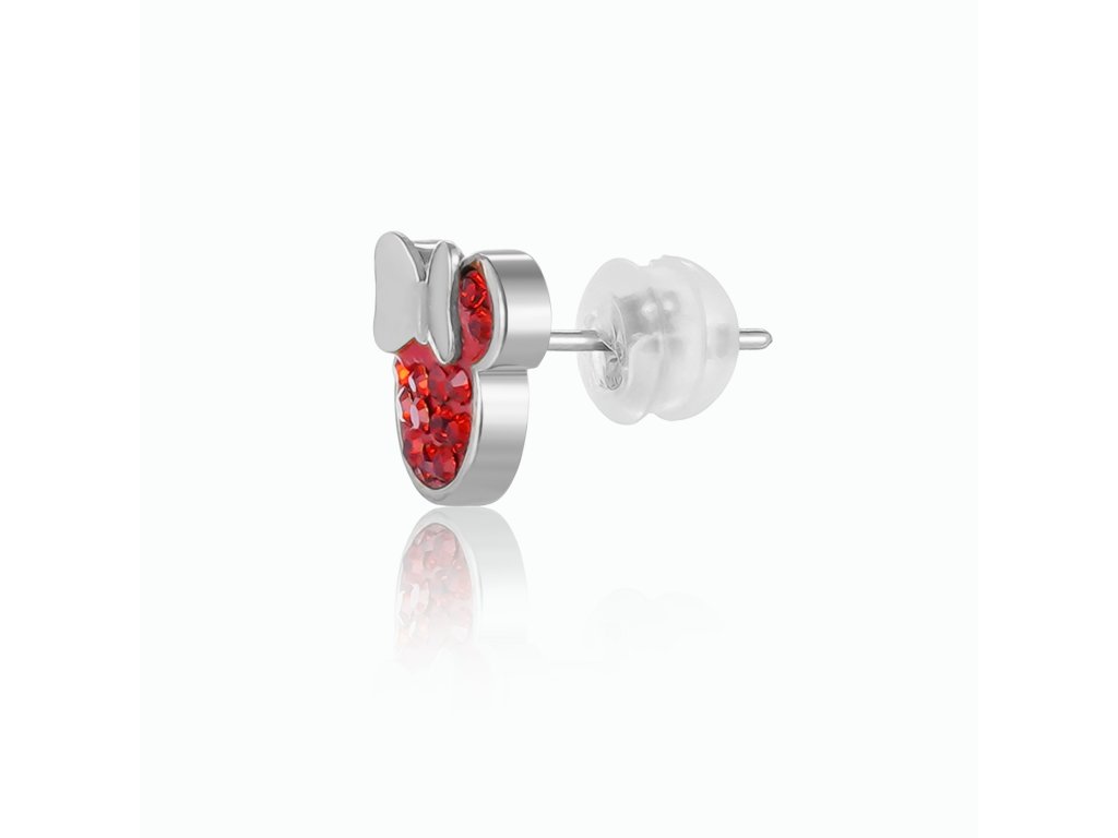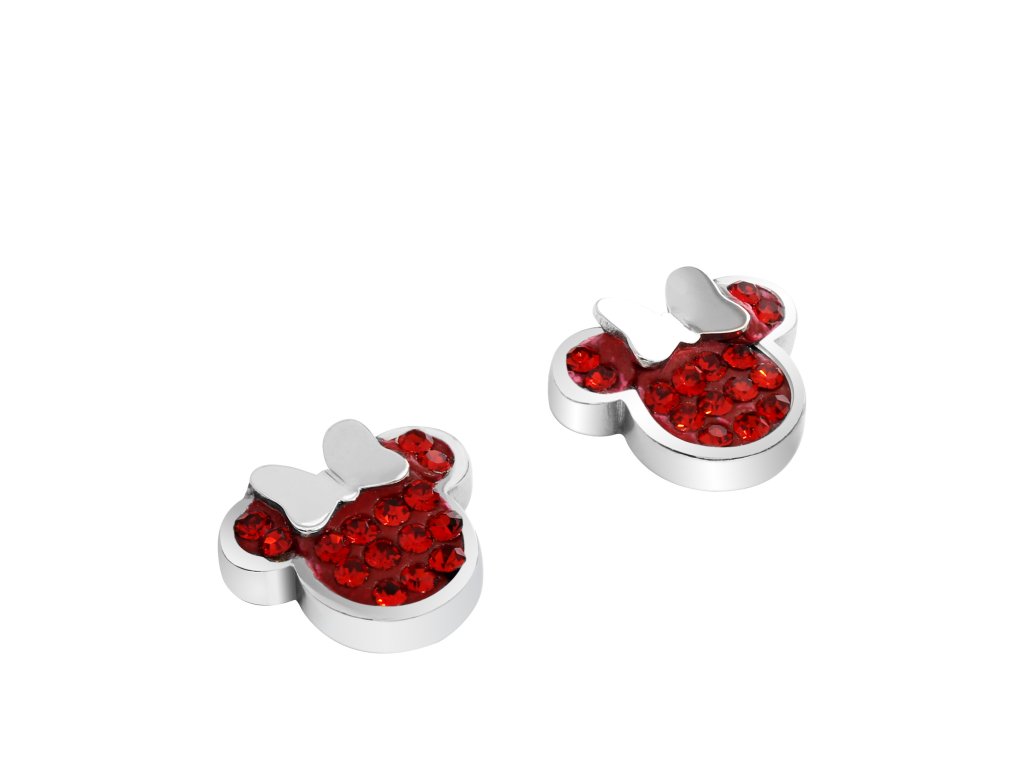 The earrings in the shape of the character Minnie Mouse from Disney are made of stainless steel with a glossy finish, from which the red crystals that decorate most of the earrings stand out very nicely . These earrings are fastened with a button, which ensures comfortable wearing and prevents them from being lost. They come in a stylish box.
