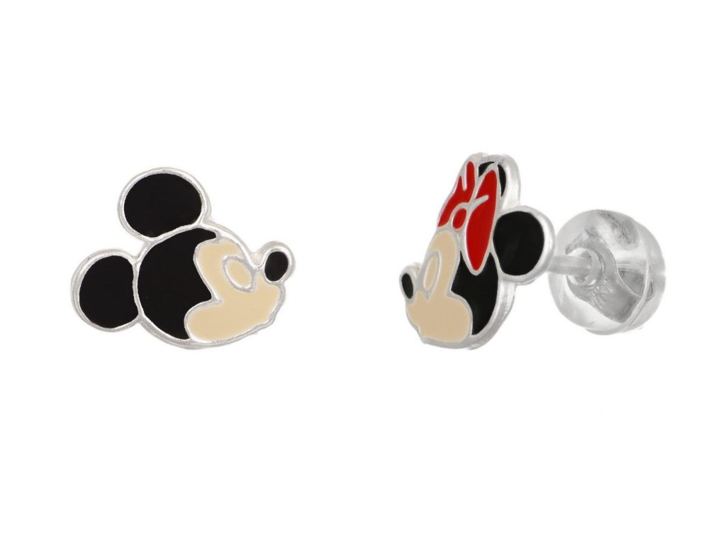 Asymmetrical earrings in the shape of the popular characters Mickey Mouse and Minnie Mouse from Disney are made of high quality sterling silver 925 with a shiny finish. They are decorated with multi-coloured enamel. They are fastened with a classic button, which ensures comfortable wearing and prevents loss of earrings. These baby earrings come in a stylish box. The weight of the jewel is 0,8 g.