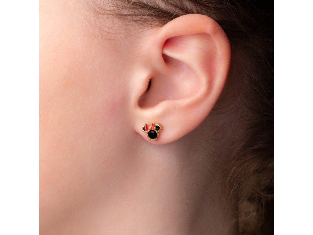Asymmetrical earrings in the shape of the popular characters Mickey Mouse and Minnie Mouse from Disney are made of high quality sterling silver with a shiny finish. They are decorated with cut black crystals that stand out nicely in gold-plated silver of 925 purity. The bowl is decorated with red enamel. These earrings fasten with a classic button, which ensures a comfortable fit and prevents the earrings from being lost. They come in a stylish box. The weight of the jewel is 1,2 g.