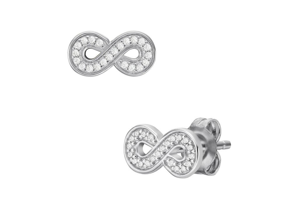 Infinity earrings are made of 925 sterling silver and have the shape of the infinity symbol. They are decorated with small clear crystals. They fasten with a button and weigh 2 g.