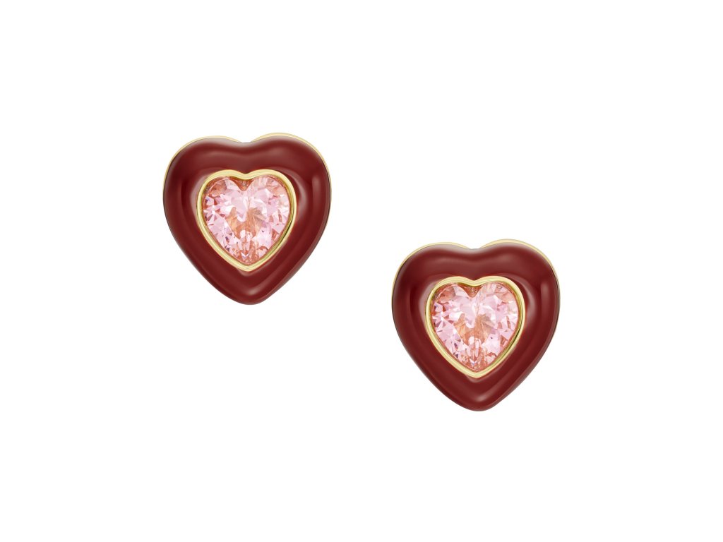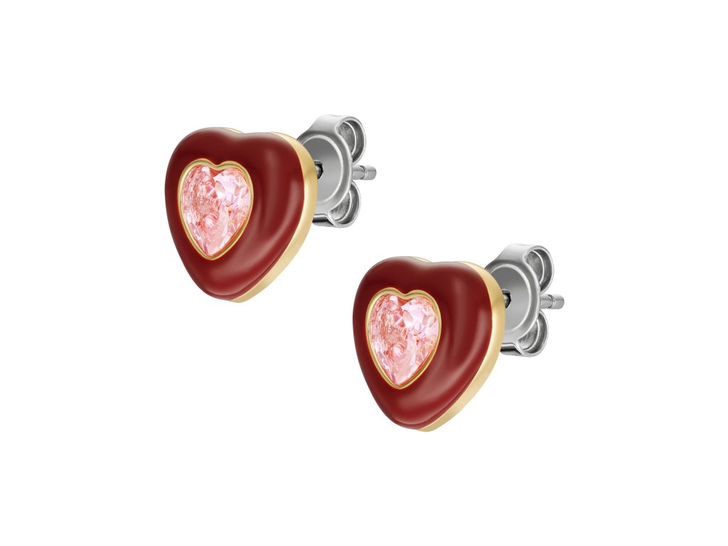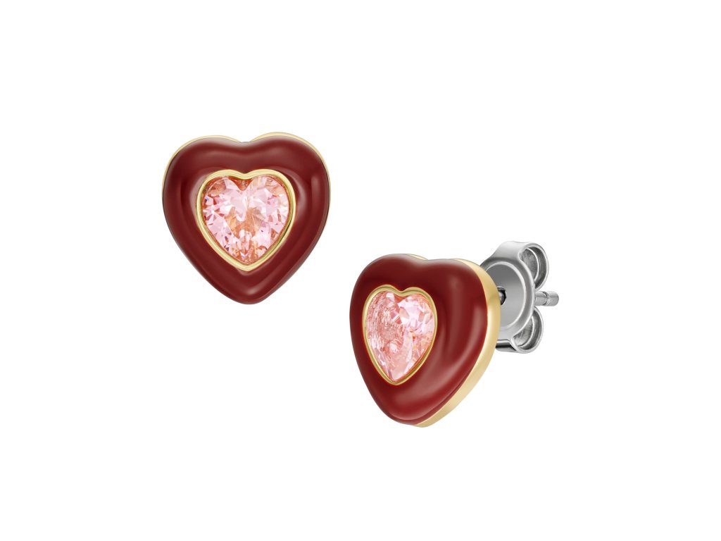 The base of the Sadie Candy Hearts earrings is gold-plated brass, which is decorated with red enamel. The sparkling effect is given by a pink heart-shaped crystal placed in the middle of the jewel. The earrings have a button fastening.