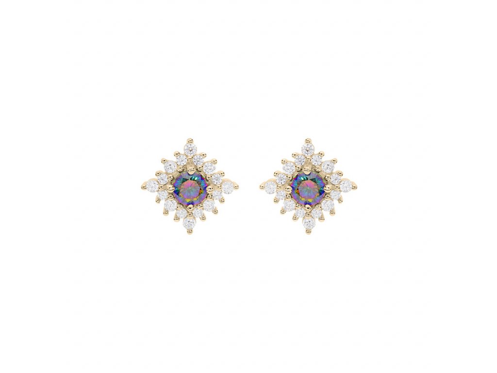 The earrings are made of 925/1000 sterling silver and finished with gold plating, which gives them a warm golden hue. The dominant element is a rainbow cubic zirconia crystal, sensitively complemented by clear crystals. Thanks to the size of 0.8 × 0.8 cm, they are light, comfortable, and suitable for everyday wear. The weight of the jewellery is 1.7 g.