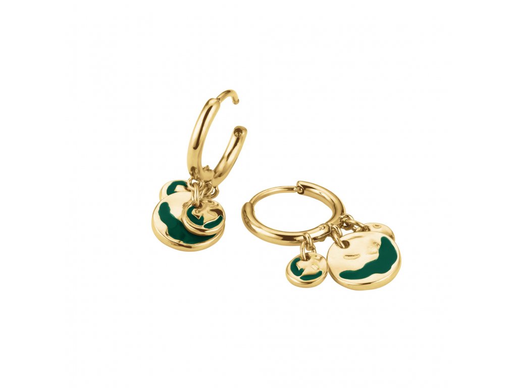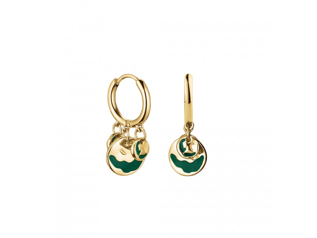 These dangle earrings with coin-shaped pendants will catch the eye thanks to their colourful design , but the spare design gives them a graceful feel. Emerald green is a colour full of energy and in combination with gold it looks very harmonious.