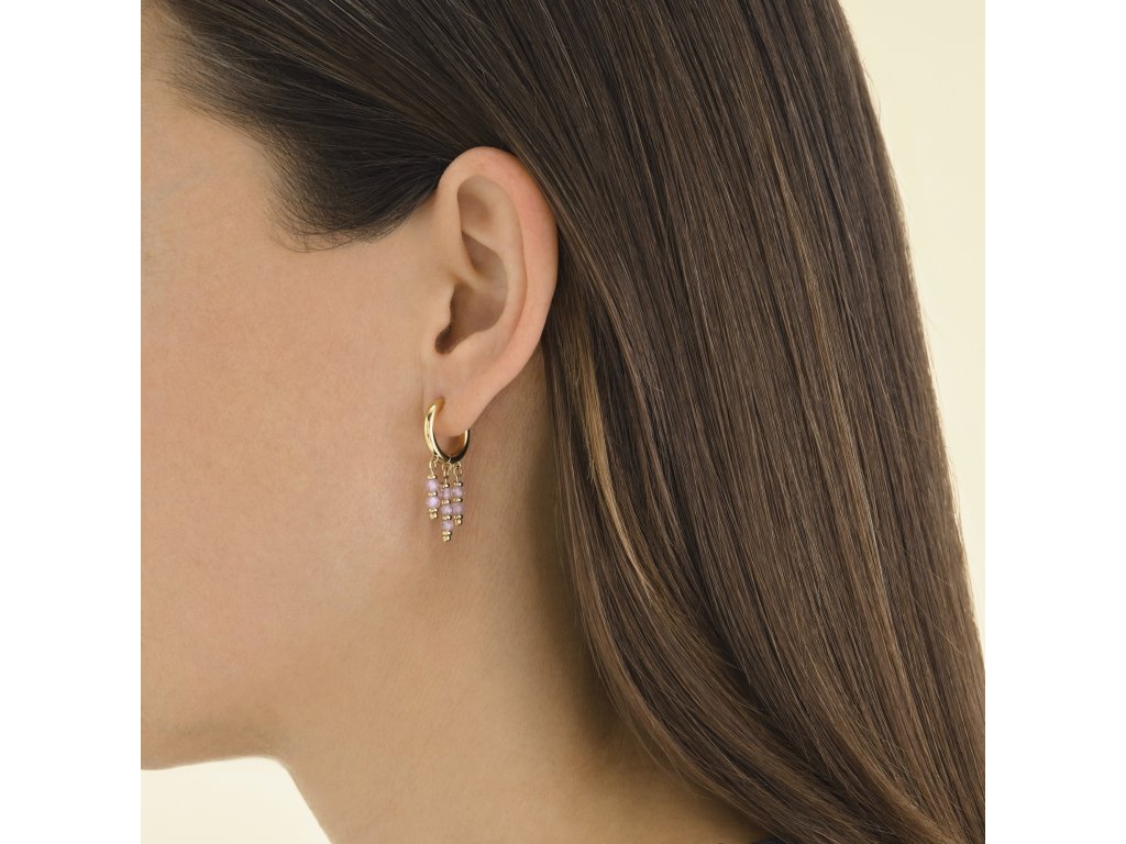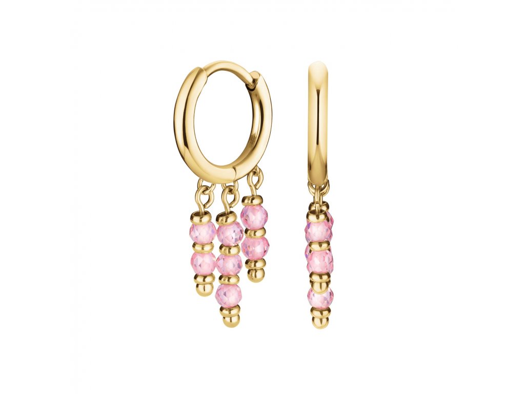 The combination of the small golden ring and the tiny pink beads hanging from the ring is playful and unassuming.