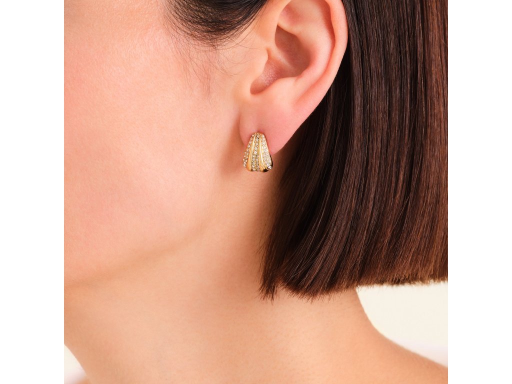 Precisely set small crystals give the earrings a festive atmosphere without being too ostentatious. Their classic profile and dimensions of 1.4 x 1.1 cm guarantee that this model will perfectly complement both an elegant outfit and a formal look. Gold-plated stainless steel and butterfly clasp ensure comfortable and secure wear all day long.