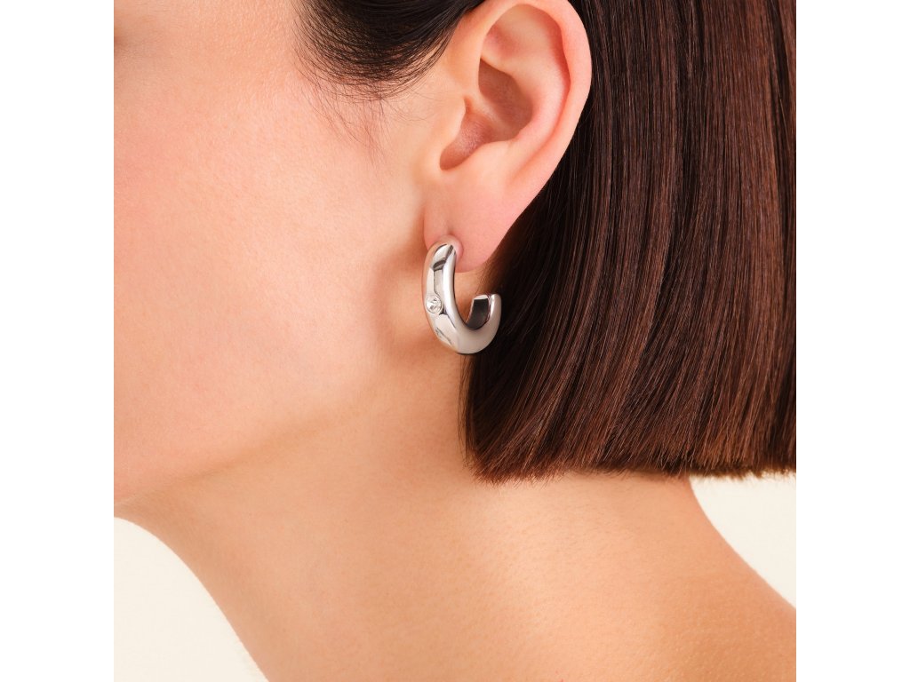The smooth semi-circular shape with a diameter of 2.7 cm is complemented by a single centrally set crystal, which gives the earrings a sophisticated look and a subtle shine. The more massive silhouette looks luxurious, but retains clean lines that remain timeless.