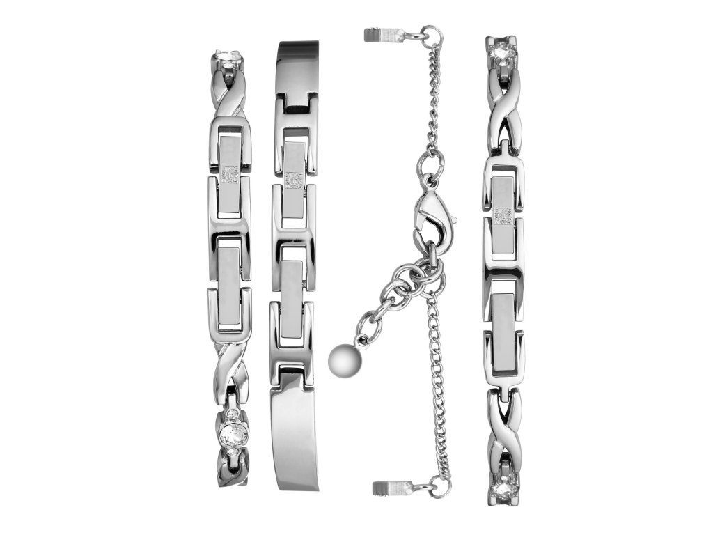 Ladies wrist watch. The watch case and bracelet are made of nickel-free base metal in silver. The dial is pearly white. The watch is sold with 3 other bracelets of the same design. Water resistance 30 M.Additional parameters