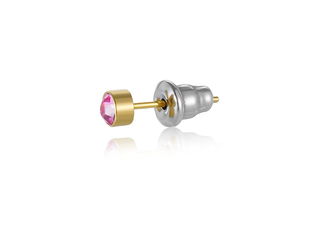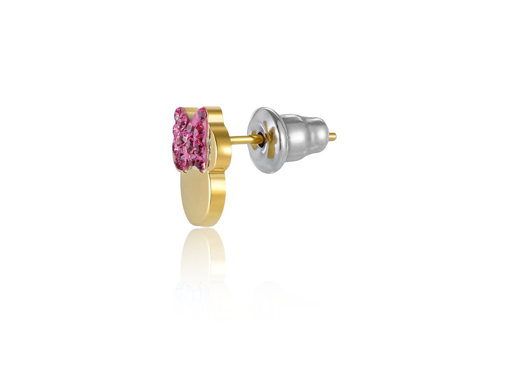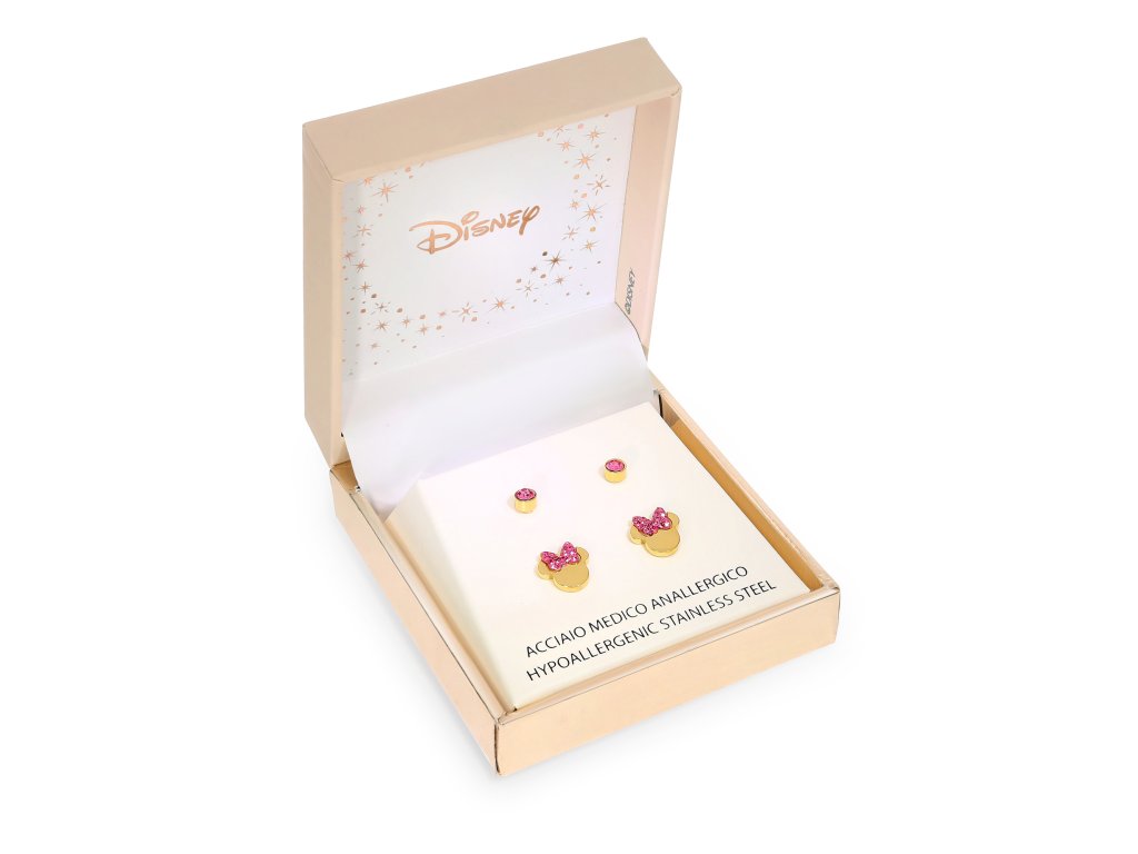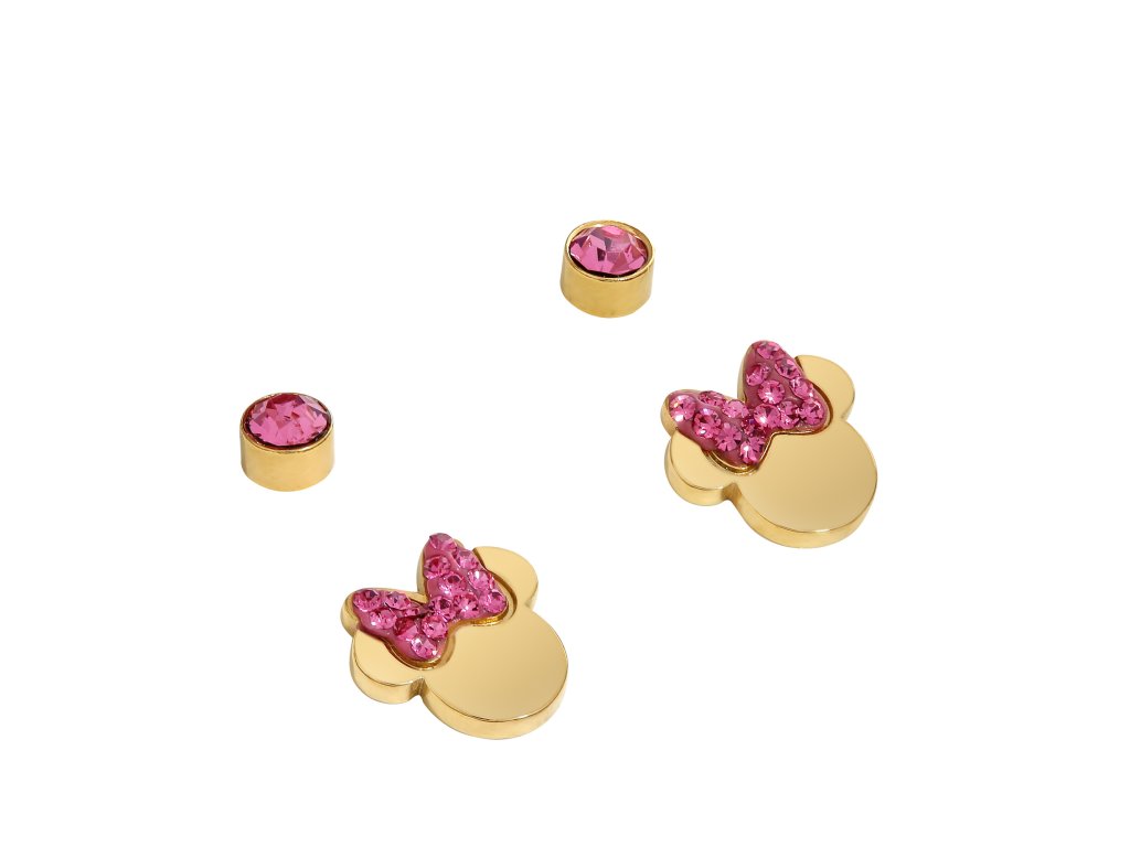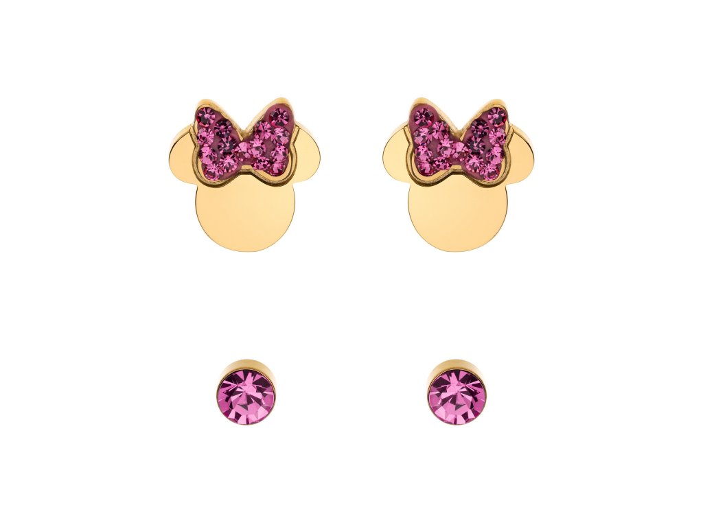 The Disney earring set contains two pairs of earrings, one pair in the shape of Minnie Mouse's head and the other in the shape of the pips. The earrings are made of gold plated stainless steel with a shiny finish. The Minnie Mouse bow is decorated with fuchsia crystals and each stone is set with one fuchsia crystal, which dominates these tiny earrings. Together with the golden colour it creates a charming combination. Both pairs are fastened with a button, which ensures comfortable wearing and prevents loss of earrings. They come in a stylish box.
