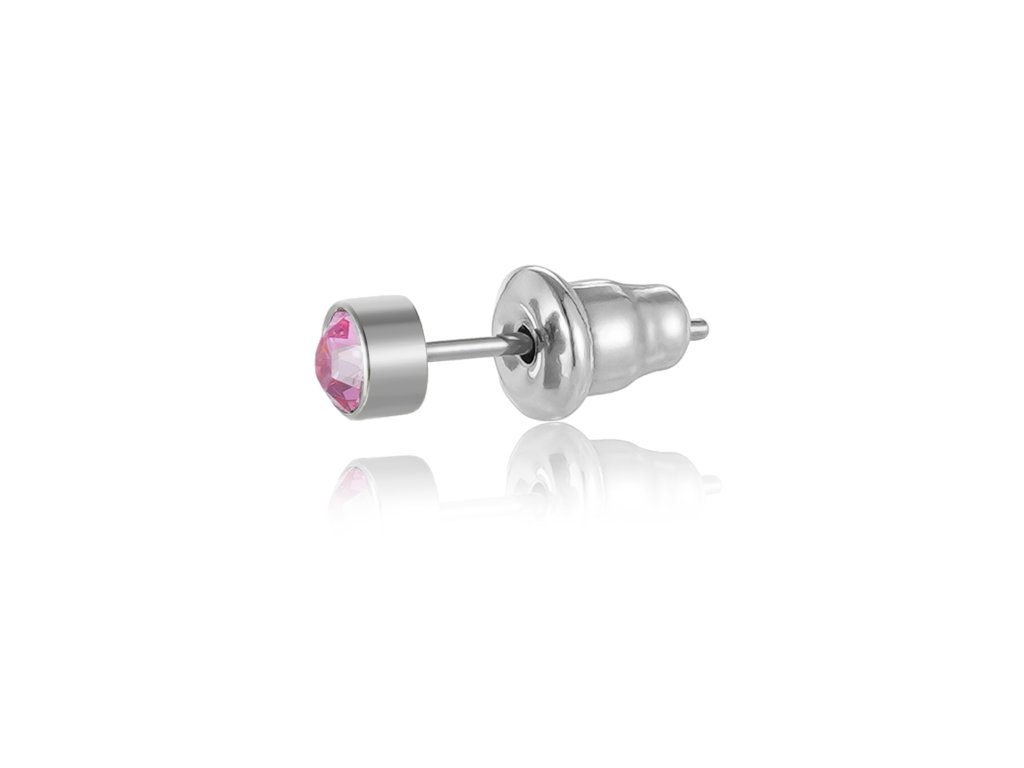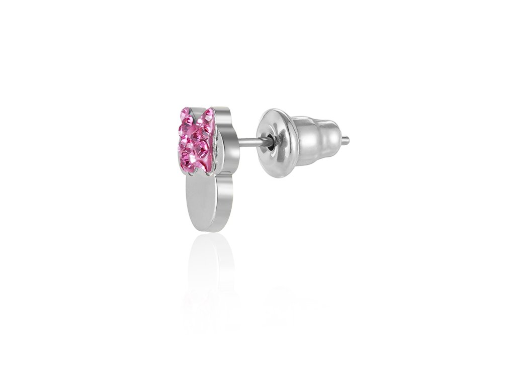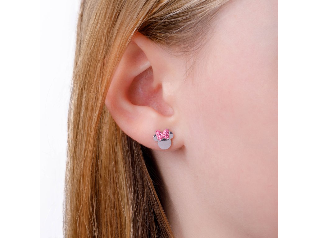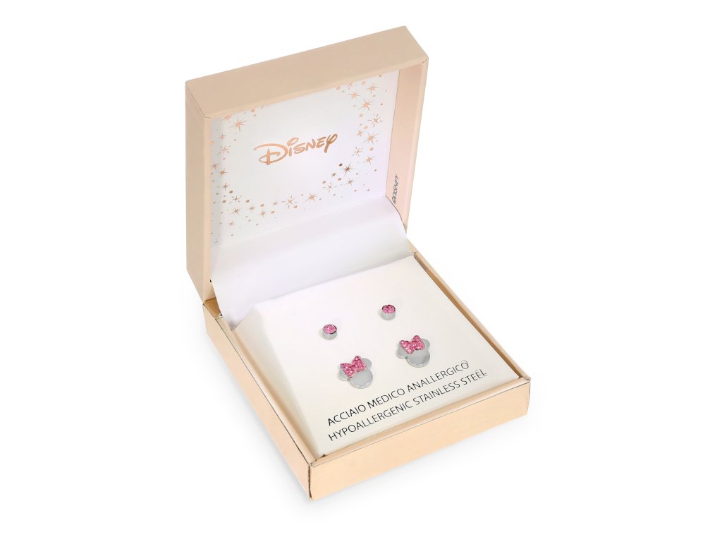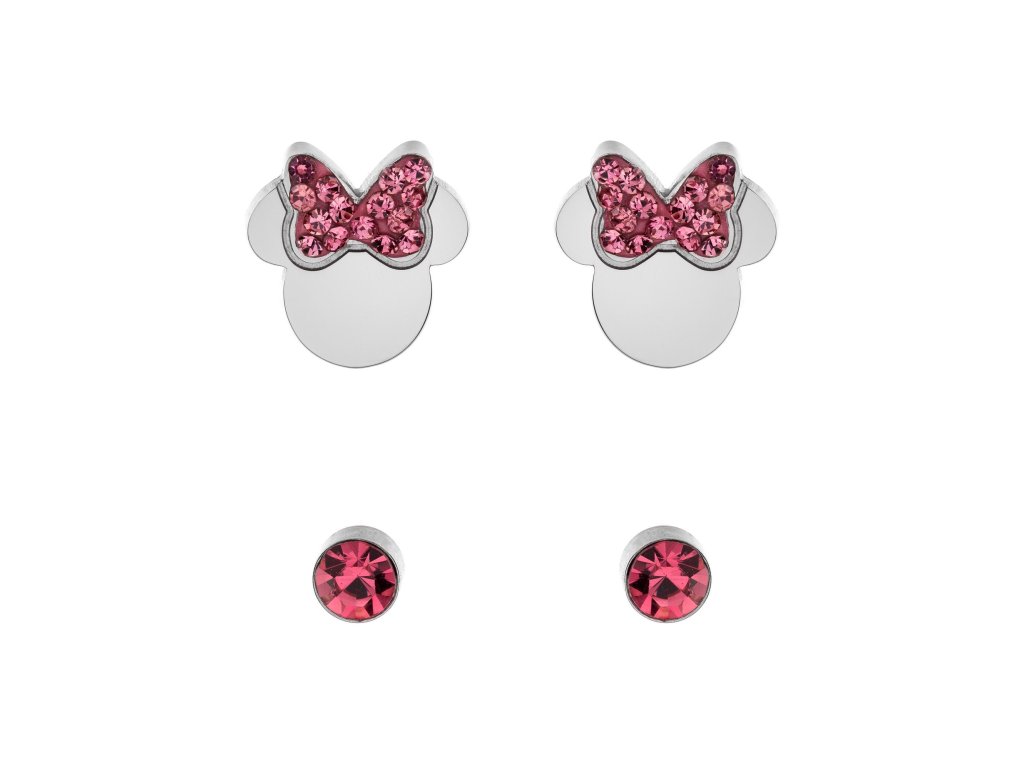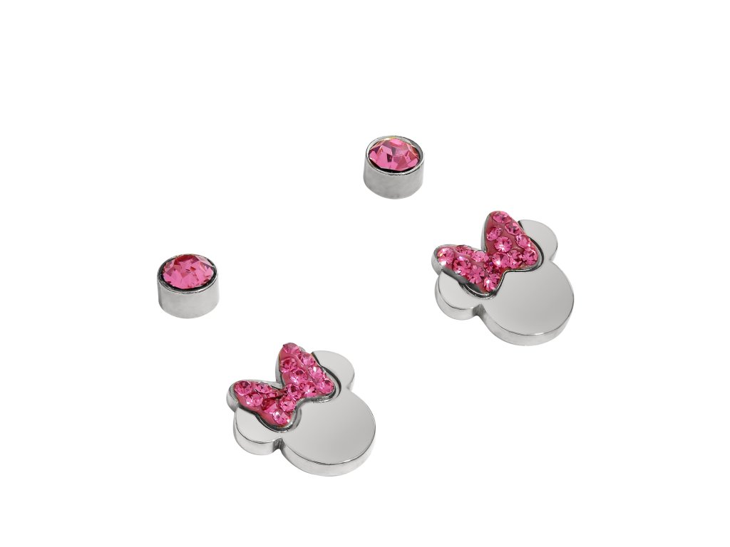 The Disney earring set contains two pairs of earrings, one pair in the shape of Minnie Mouse's head and the other in the shape of the pips. The earrings are made of stainless steel with a glossy finish. The Minnie Mouse bow is decorated with fuchsia crystals and each stone is set with one fuchsia crystal, which dominates these tiny earrings. Both pairs are fastened with a button, which ensures comfortable wearing and prevents loss of earrings. They come in a stylish box.