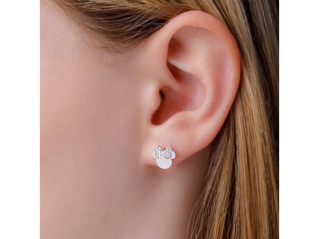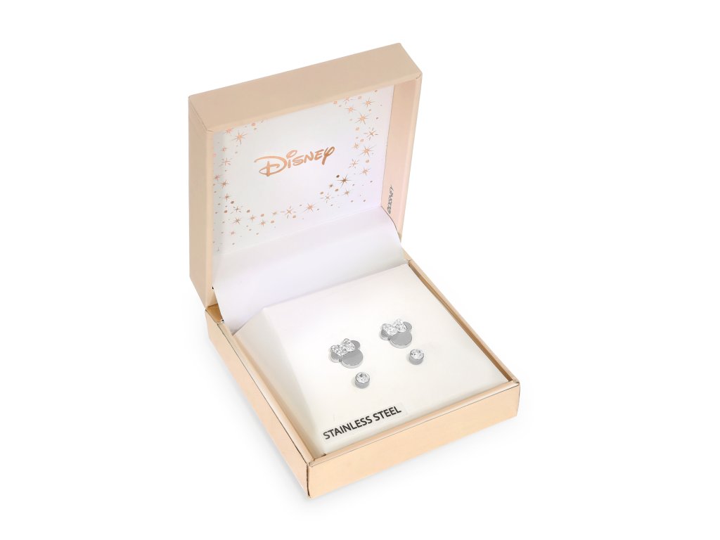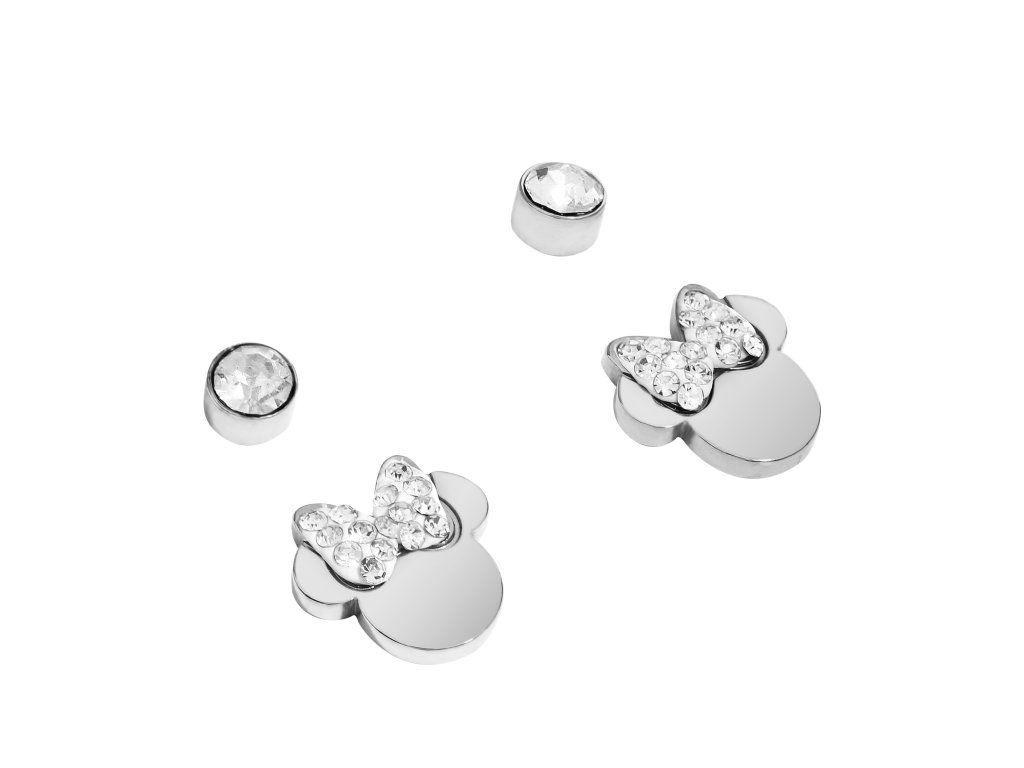 The Disney earring set contains two pairs of earrings, one pair in the shape of Minnie Mouse's head and the other in the shape of the pips. The earrings are made of stainless steel with a glossy finish. Minnie Mouse's bow is decorated with clear crystals and one clear crystal is set into each stone to dominate these tiny earrings. Both pairs are fastened with a button, which ensures comfortable wearing and prevents loss of earrings. They come in a stylish box.