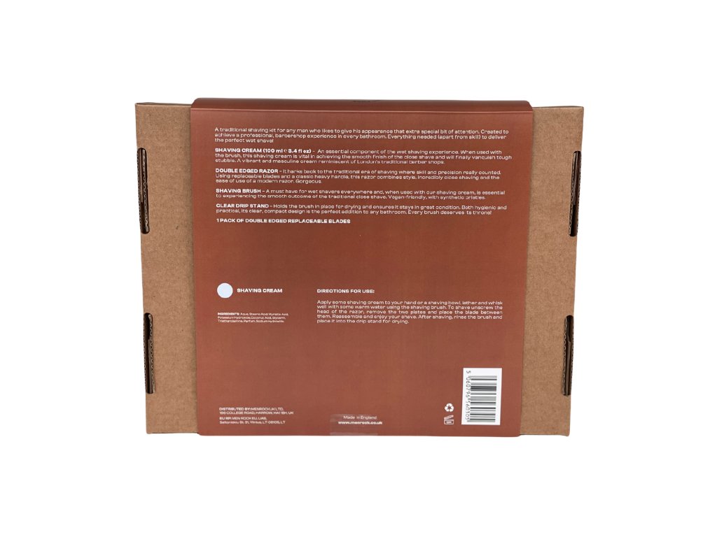 Everything you need (except skill) for a perfect wet shave! A great gift for any man who likes to pay special attention to his appearance. Created to achieve a professional, barber shop-like experience in every bathroom. Contains: Double-edged razor The double-edged razor harks back to the traditional era of shaving, which requires precision and skill. With interchangeable blades and a classic heavy-duty handle, it combines style, an incredibly close shave and ease of use. Beautiful. Sandalwood Shaving Cream (100 ml) An essential part of the wet shaving experience. When used with a brush, this shaving cream is essential for achieving a smooth finish. With a close shave, it can handle even tough stubble. With a natural sandalwood scent reminiscent of a traditional London barbershop. Shaving brush This vegan shaving brush with synthetic bristles mixes hot water and shaving cream into a surprisingly thick lather, allowing for a much more comfortable shave. Helps remove unwanted dead skin and prevent nicks, cuts or irritation when shaving. Shaving brush stand Every brush deserves its throne! This storage rack holds the brush in place while drying and ensures it stays in great condition. It is both hygienic and practical and its transparent, compact design is the perfect addition to any bathroom. 1 pack of interchangeable double-edged blades.Additional parameters
