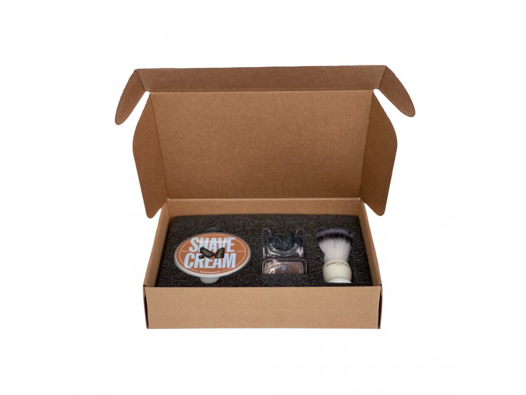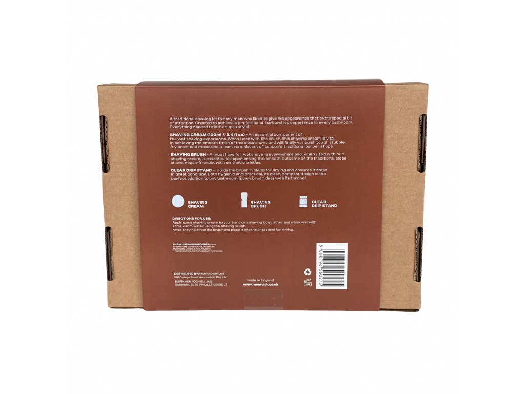 Everything you need for a stylish shave! The perfect gift for any man who likes to pay special attention to his appearance. Created to achieve a professional, barber shop-like experience in every bathroom. Contains: Sandalwood Shaving Cream (100 ml) An essential part of the wet shaving experience. When used with a brush, this shaving cream is essential for achieving a smooth finish. With a close shave, it can handle even tough stubble. With a natural sandalwood scent reminiscent of a traditional London barbershop. Shaving brush This vegan shaving brush with synthetic bristles mixes hot water and shaving cream into a surprisingly thick lather, allowing for a much more comfortable shave. Helps remove unwanted dead skin and prevent nicks, cuts or irritation when shaving. Shaving brush stand Every shaving brush deserves its throne! This storage rack holds the brush in place while drying and ensures it stays in great condition. It is both hygienic and practical and its transparent, compact design is the perfect addition to any bathroom.Additional parameters