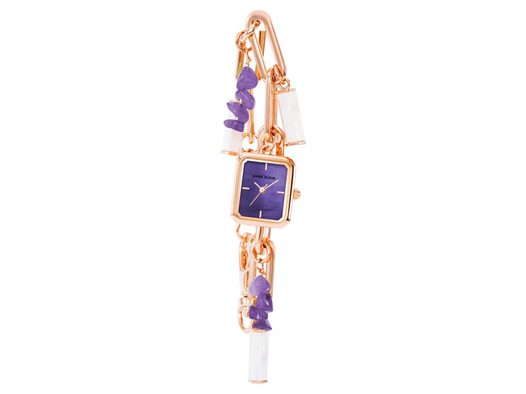 The dial is anchored to a rose gold-tone metal chain. It is decorated with several decorative pendants and purple stones. The pinkish-gold, square-shaped case stands out with its unique hue, which blends perfectly with the purple dial dominated by delicate golden indices and elegant hands.