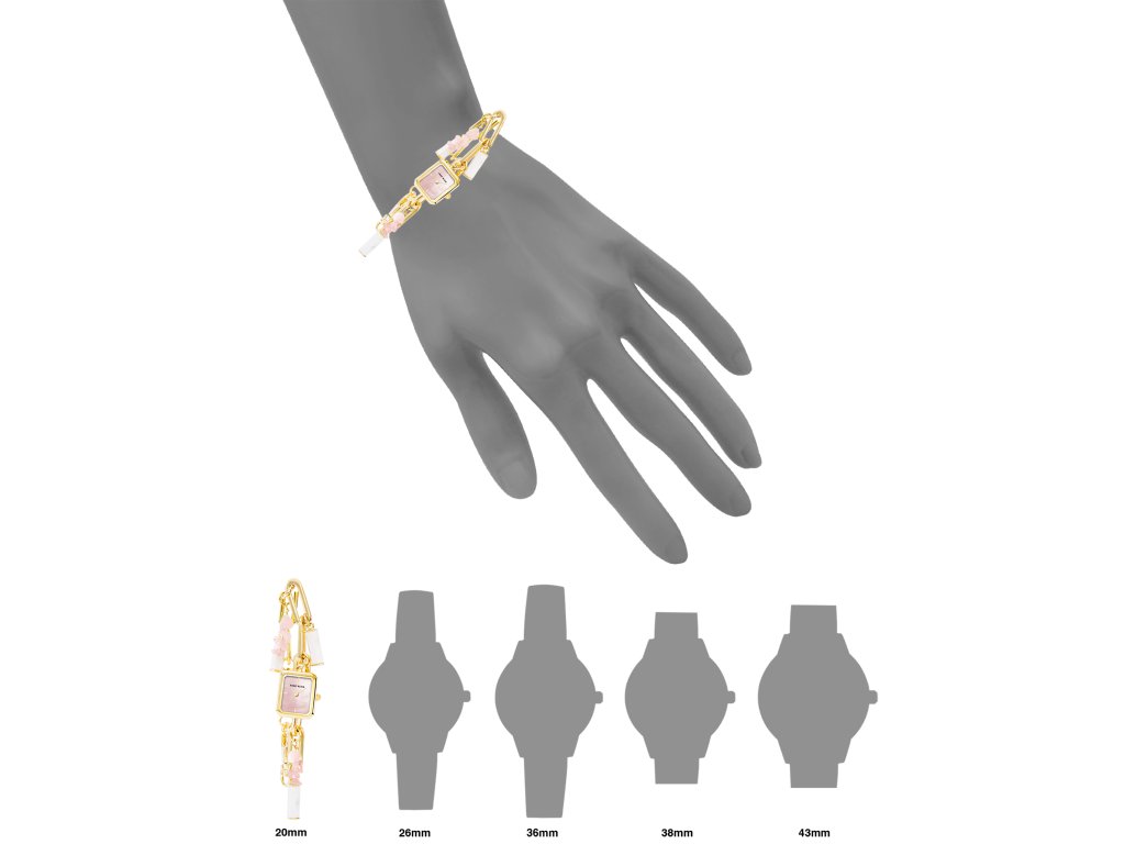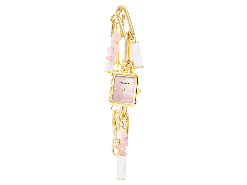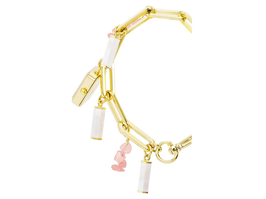 The dial is anchored to a gold-tone metal chain. It is decorated with several decorative pendants and pink stones. The square-shaped case blends perfectly with the pink dial, which is dominated by delicate golden indices and elegant hands.