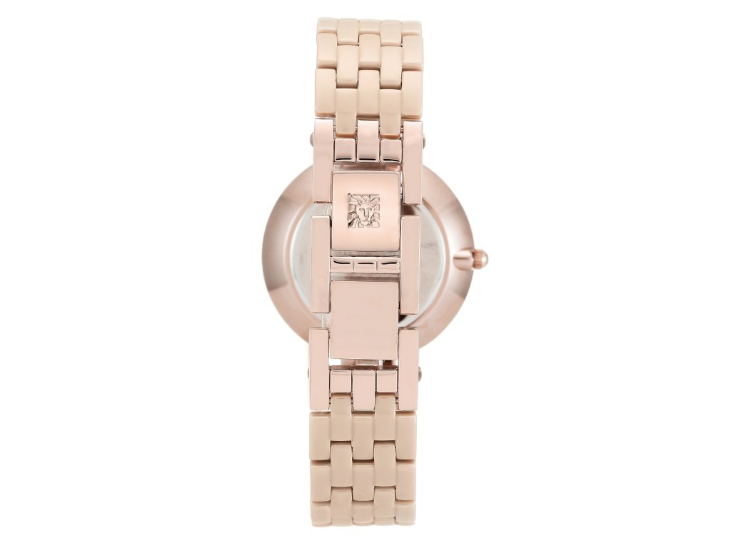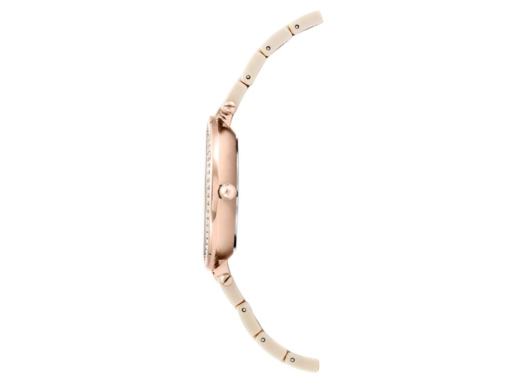 The Anne Klein watch in a delicate beige-rose gold design looks elegant, yet subtle. The crystal-decorated dial matches the colours of the strap and case, creating a coherent and harmonious impression.