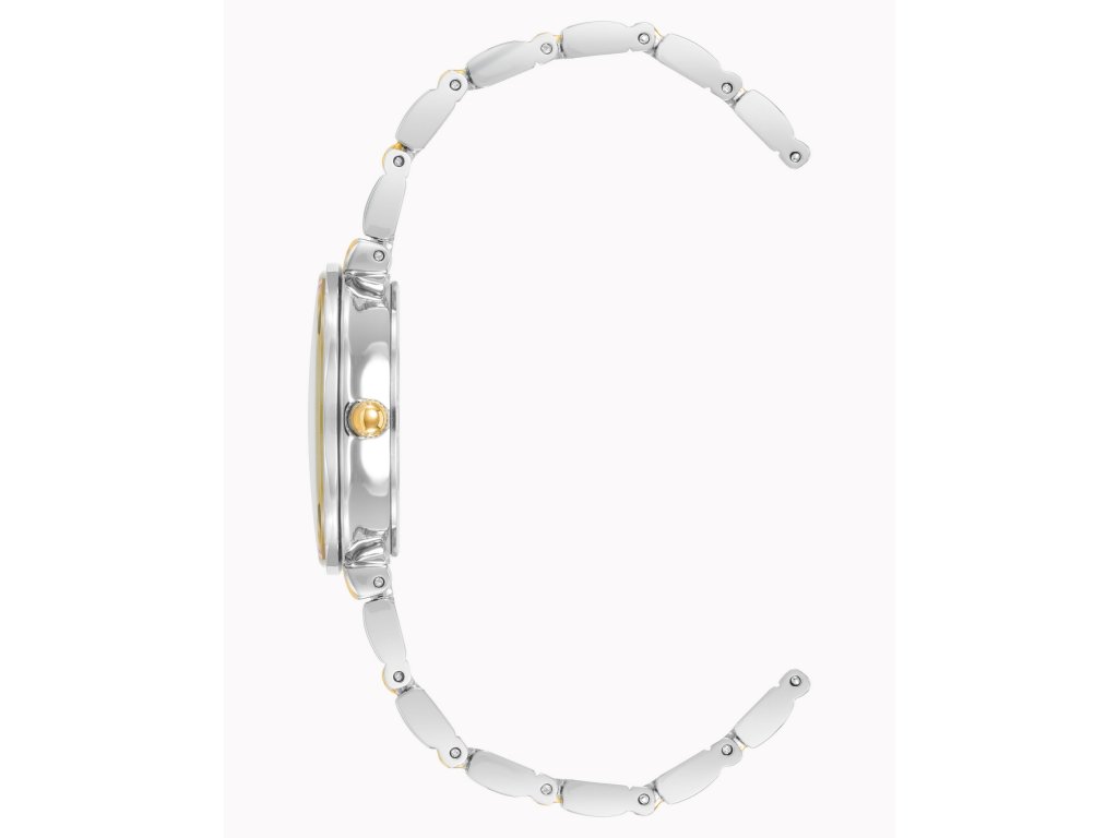 The model has a two-tone metal bracelet that combines gold and silver tones, making it a perfect match for different types of jewellery. The round gold-coloured case complements the silver-toned dial with a single diamond, giving the watch a sophisticated but subtle look. The mineral glass protects the surface of the dial and the reliable Quartz movement ensures accurate timekeeping. These watches are ideal for women looking for an everyday accessory with a touch of exclusivity.