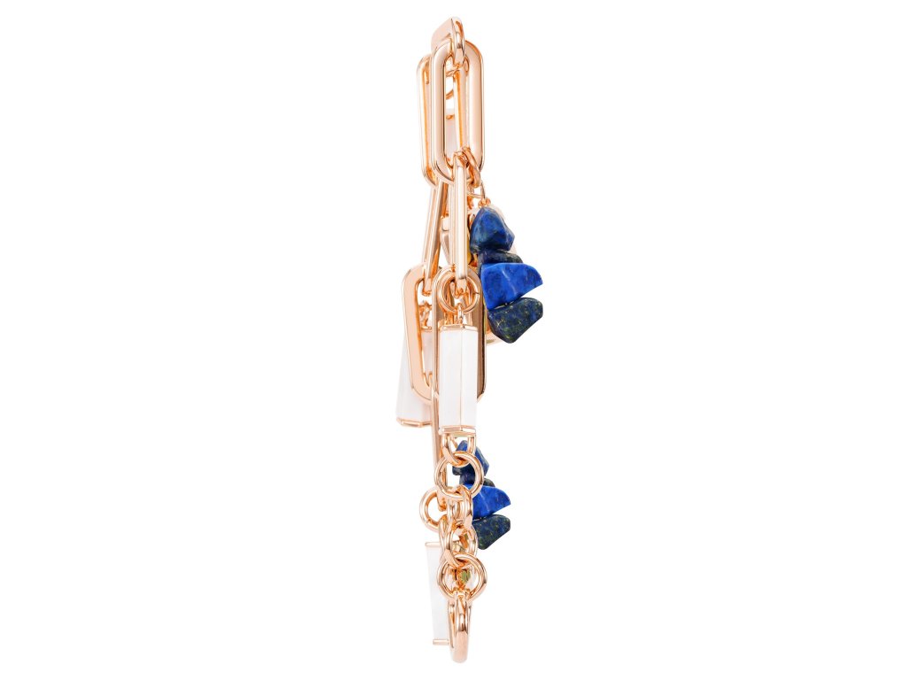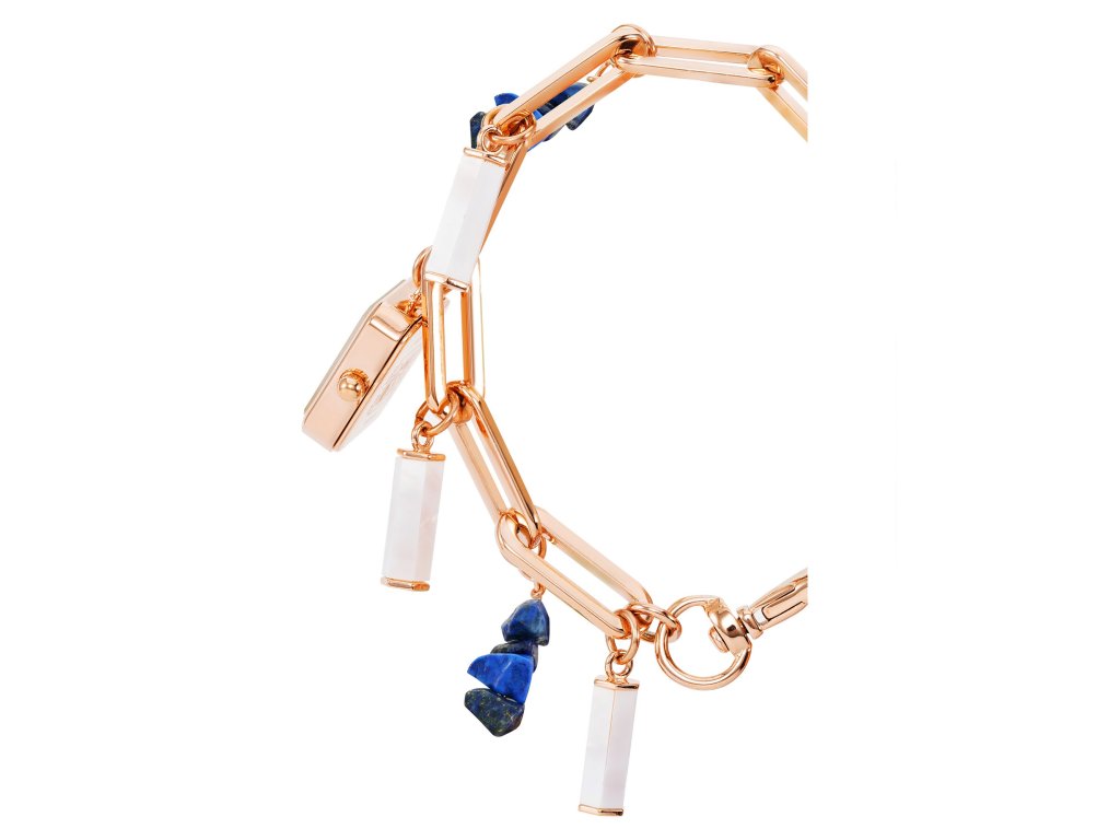 This watch impresses with pendants and a bracelet in rose gold that elegantly encircles your wrist. The square case is then suspended in the middle of the bracelet as a pendant. The indices and hands, gently glistening on the dark blue background of the dial, add to the charming appearance of the watch, which is so unmissable.