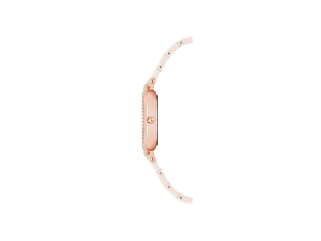 Elegant watch in light pink with rose gold details. The Anne Klein brand, named after the famous American visionary, brings all women the opportunity to express themselves with something as practical as a watch. The bright dial with a pearl effect is complemented by rose-gold indexes in the form of Roman numerals and small crystals. The whole is completed by a ceramic strap with metal details. The watch is protected by a mineral crystal and a 34 mm case. Easy fastening is ensured by a jeweler's buckle.Additional parameters