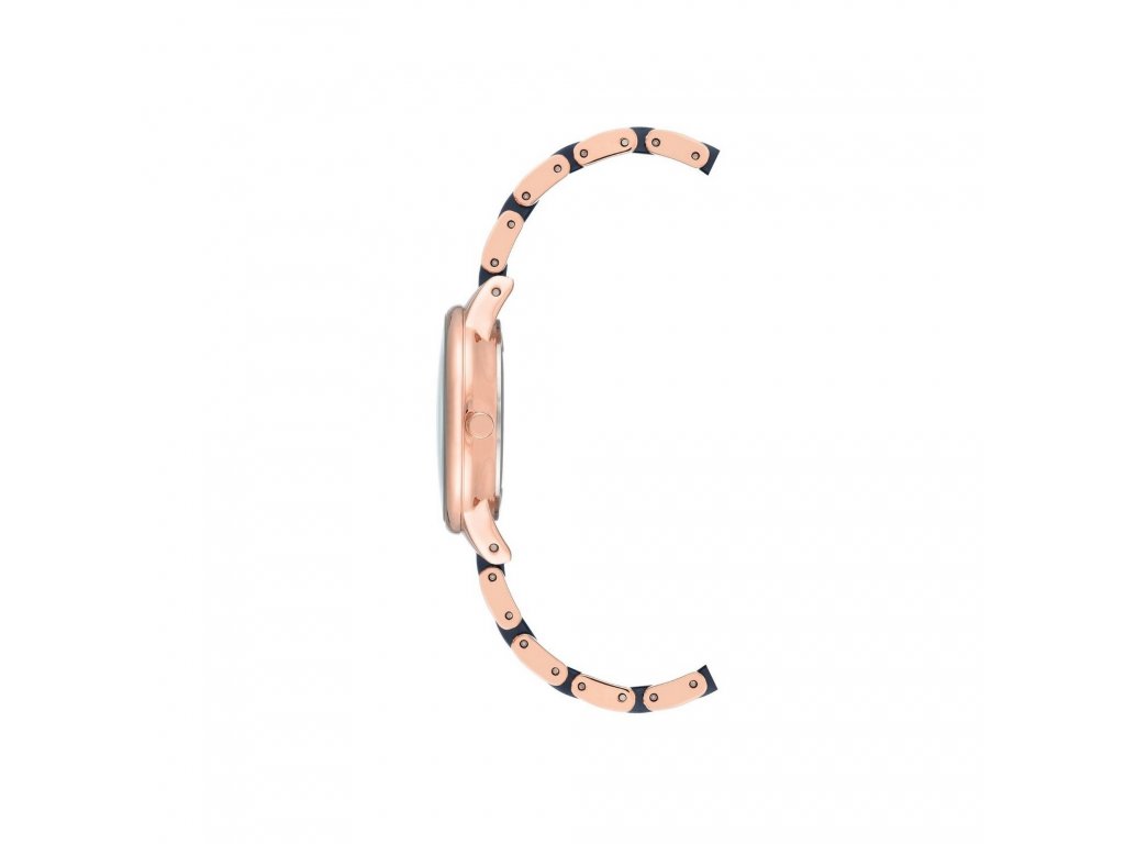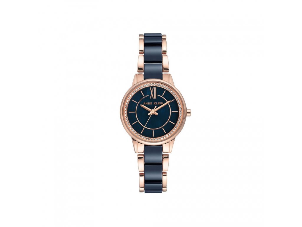 Sophisticated watch in dark blue with metal details in rose gold. The Anne Klein brand, named after the famous American visionary, brings all women the opportunity to express themselves with something as practical as a watch. The mother-of-pearl dial and stick indexes are decorated with luminous crystals. The black ceramic band is complemented by rose gold metal edges. The watch is protected by a mineral crystal and a 32 mm gold-plated case. Easy fastening is ensured by a jeweler's buckle.Additional parameters