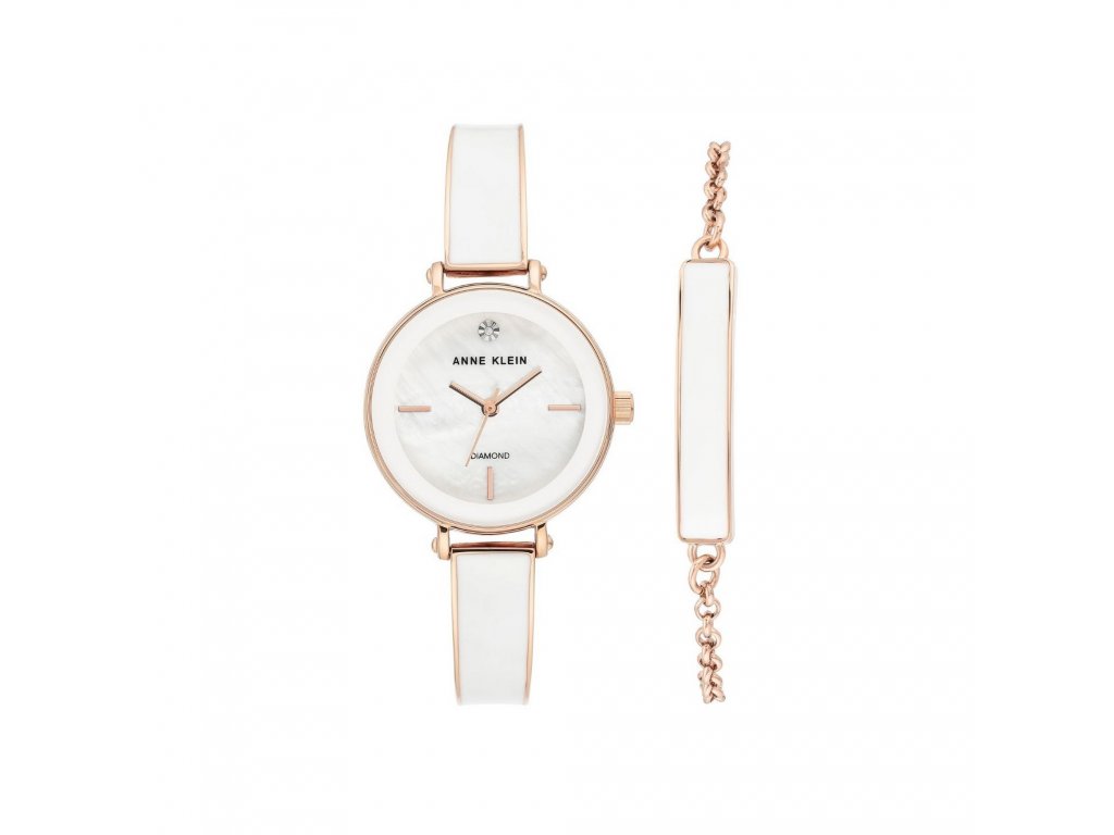 Elegant white watch with leather strap and enamel bracelet in a set. The Anne Klein brand, named after the famous American visionary, brings all women the opportunity to express themselves with something as practical as a watch. The mother-of-pearl dial is decorated with rose gold indexes in the form of sticks and a shining diamond. The whole is completed by a white enamel band with a rose-gold edge. The watch is protected by a mineral crystal and a rose gold case measuring 30 mm. The bracelet in the set is made of rose gold metal and decorated with white enamel. It can be worn at the same time as the watch or separately depending on the mood.Additional parameters