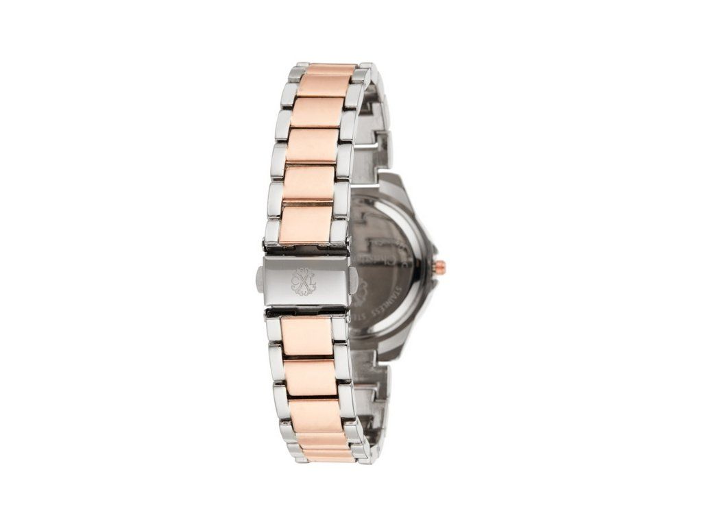 The metal bracelet in rose gold and silver, decorated with numerous crystals, matches the round case in a harmonious two-tone design complemented by sparkling details. Crystals around the bezel and in the bracelet itself emphasize the jewelry character of the model. The model is equipped with a precise Quartz movement and protected by mineral glass.