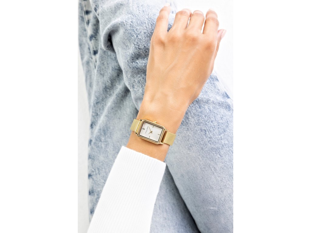 The white dial in an angular shape matches the gold-colored steel strap, which looks elegant and tasteful. The gold-tone case complements the overall design, creating a cohesive, timeless look. Mineral glass protects the dial from damage and keeps the watch beautiful even with everyday wear. This model is ideal for women seeking an accessory that combines simplicity and sophistication.