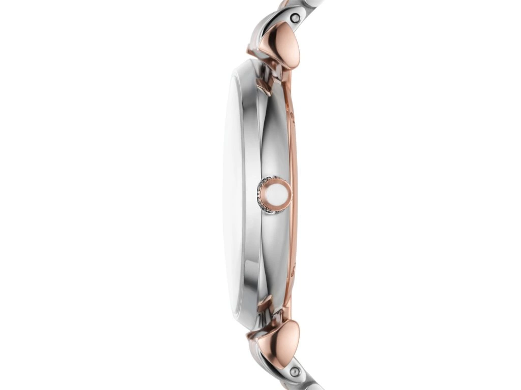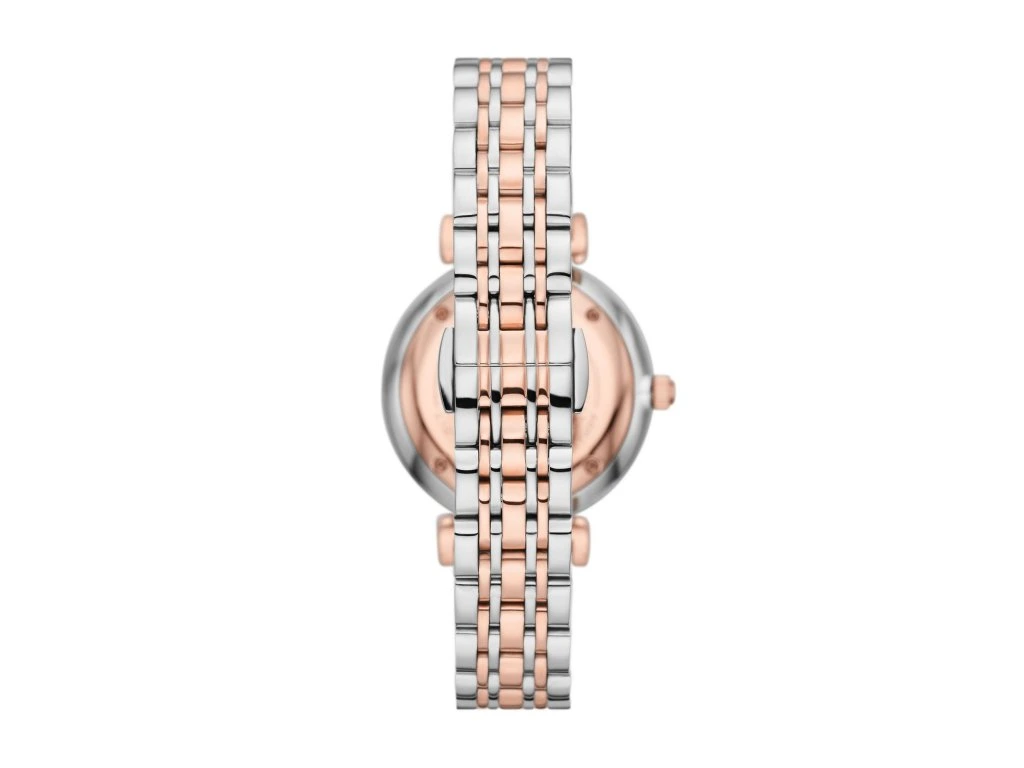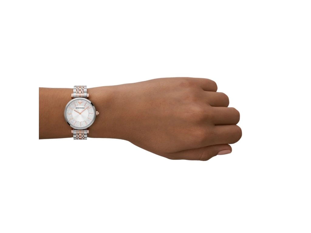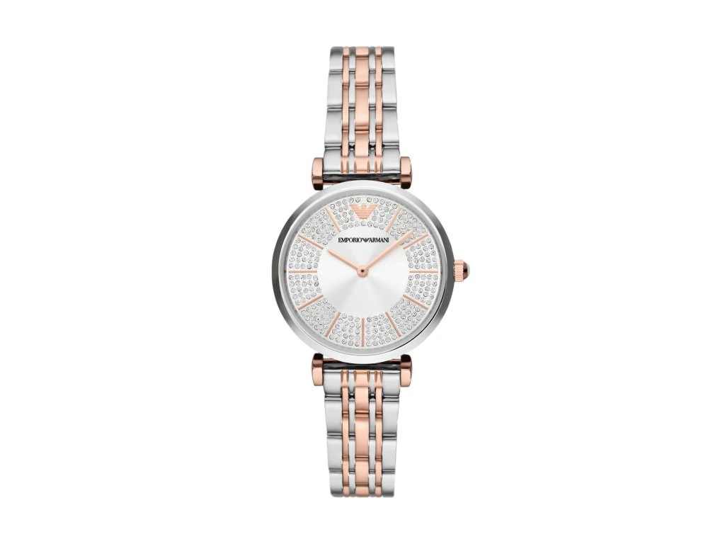 The stylish two-tone bracelet and silver dial with delicate crystals form a harmonious whole that looks sleek, yet unmistakable. The watch embodies the best of Giorgio Armani's fashion vision – timeless beauty with an overlap into contemporary style.