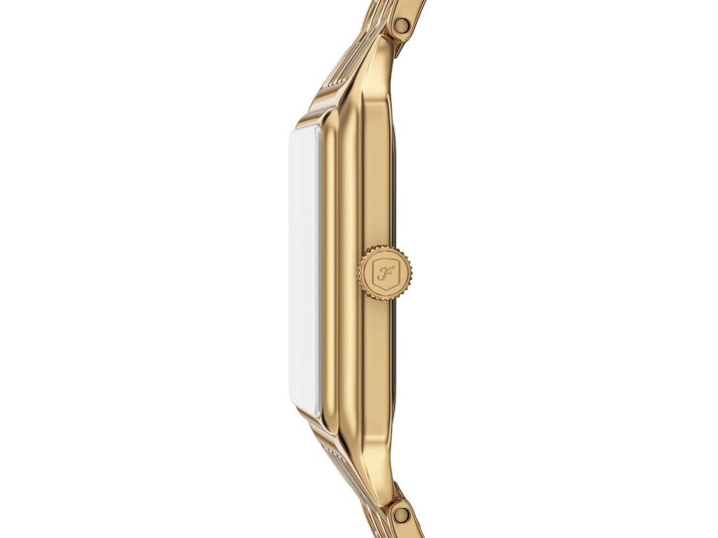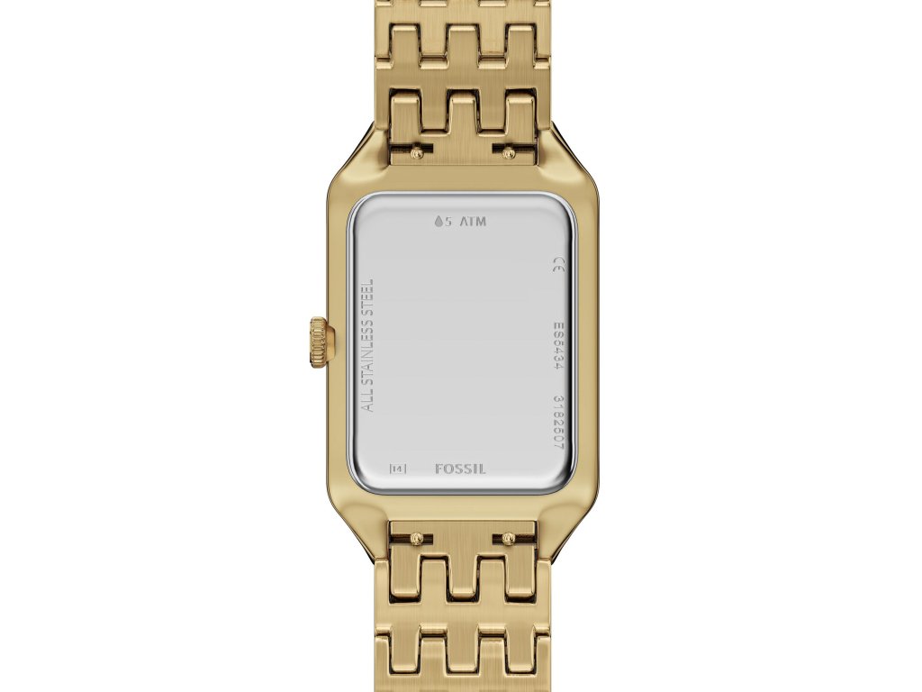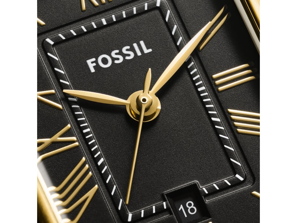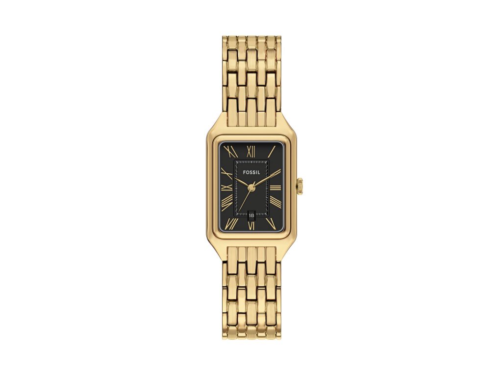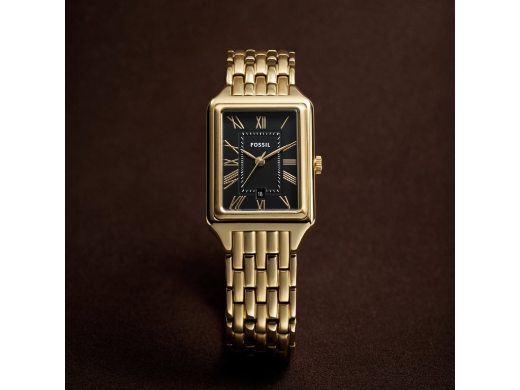 Fossil Raquel are watches that combine a vintage silhouette with modern elegance. Gold finish adds a luxurious touch, while the rectangular case and satin black dial with Roman numerals create a sophisticated contrast.