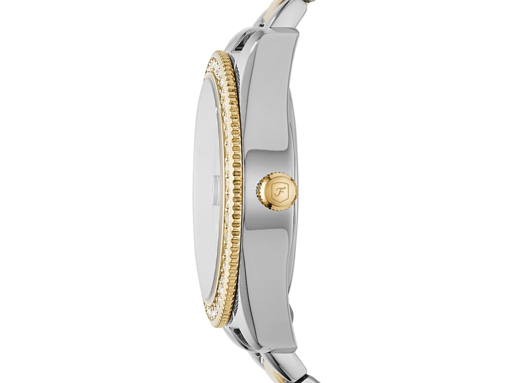 The 32 mm dial creates a sophisticated impression, while the round case decorated with crystals looks refined. The steel strap in the popular gold and silver colour combination adds a touch of elegance and comfort to the watch. This watch is the right accessory for every woman who appreciates beauty and precision.