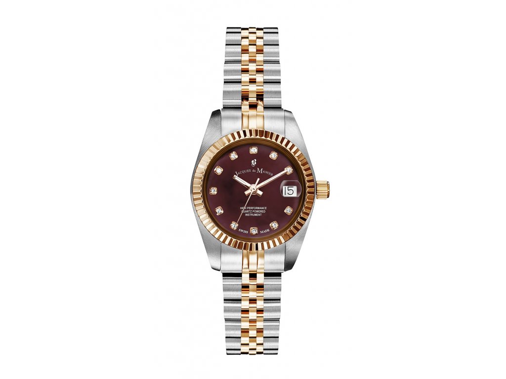 Bicolour ladies watch with steel, rose gold, dark brown dial and scalloped lunette. As an extra gift, you will receive an original Jacques du Manoir box with roses.