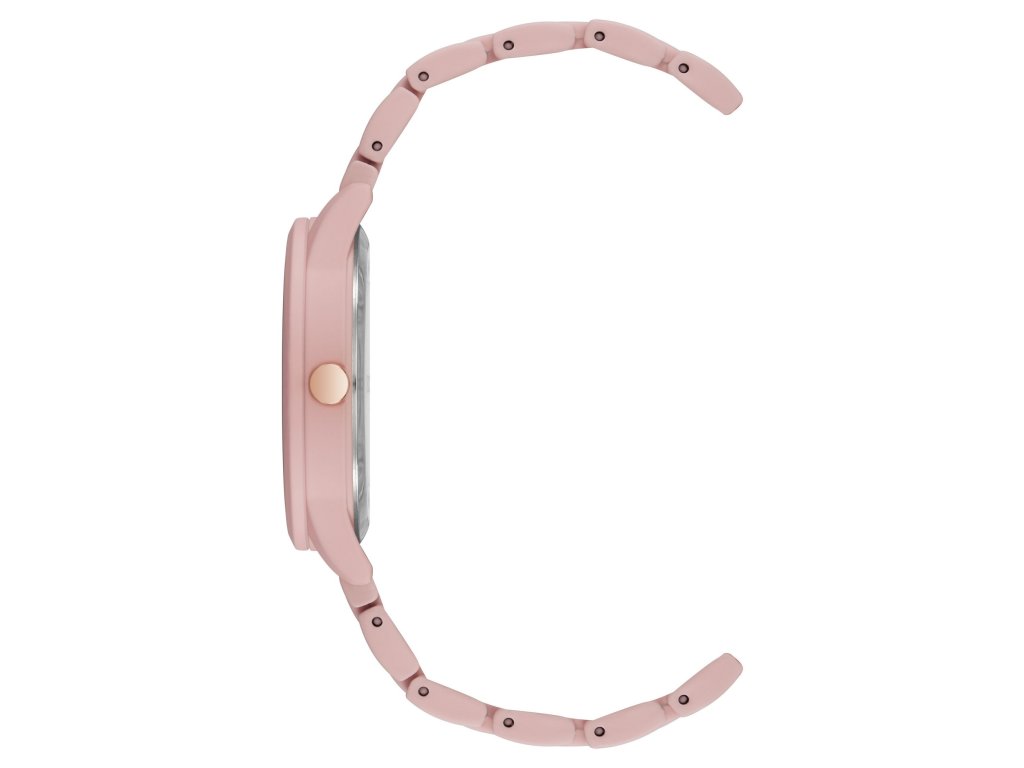 The watch stands out with its metal strain, which gives this accessory a sophisticated look and ensures comfortable everyday wear. The glossy round case is designed to blend harmoniously with the overall design. The 35 mm dial, as well as the subtle indices and hands, are also pink in tone. It is lined with sparkling crystals that add a touch of dazzle to the watch. The watch looks very stylish.