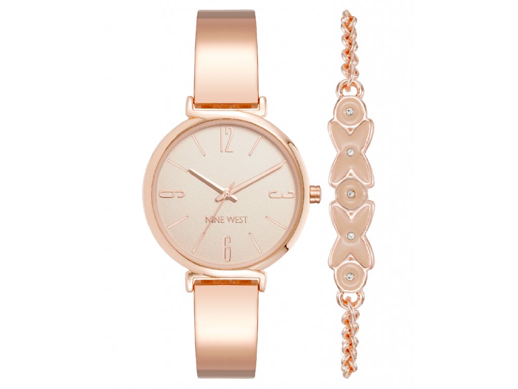 Ladies gift set of watch and bracelet in rose gold. Monochrome watch with a dial that combines line and numeric indices. The bracelet is complemented with sparkling silver rhinestones. The perfect gift for your loved ones!Additional parameters
