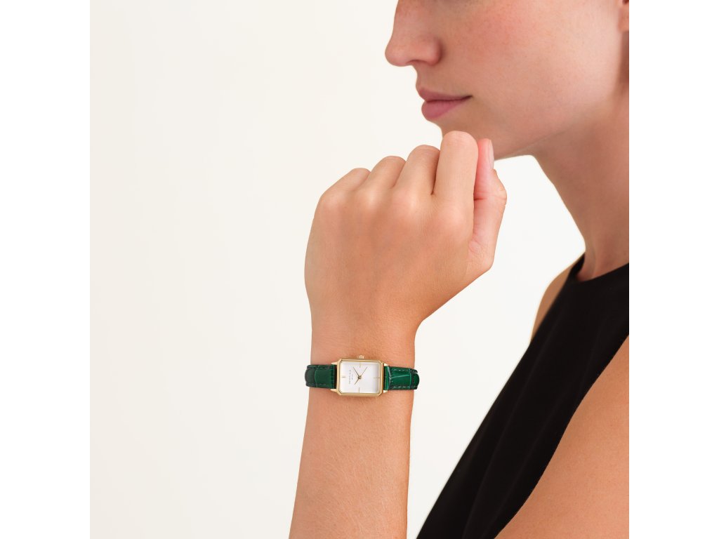 The gold-tone octagonal case gives the model an iconic look with a touch of art deco. The white dial and green leather strap create an unexpectedly fresh combination - delicate, yet with personality. Thanks to the smaller XS size, the watch looks subtle and fits perfectly even on a delicate wrist.