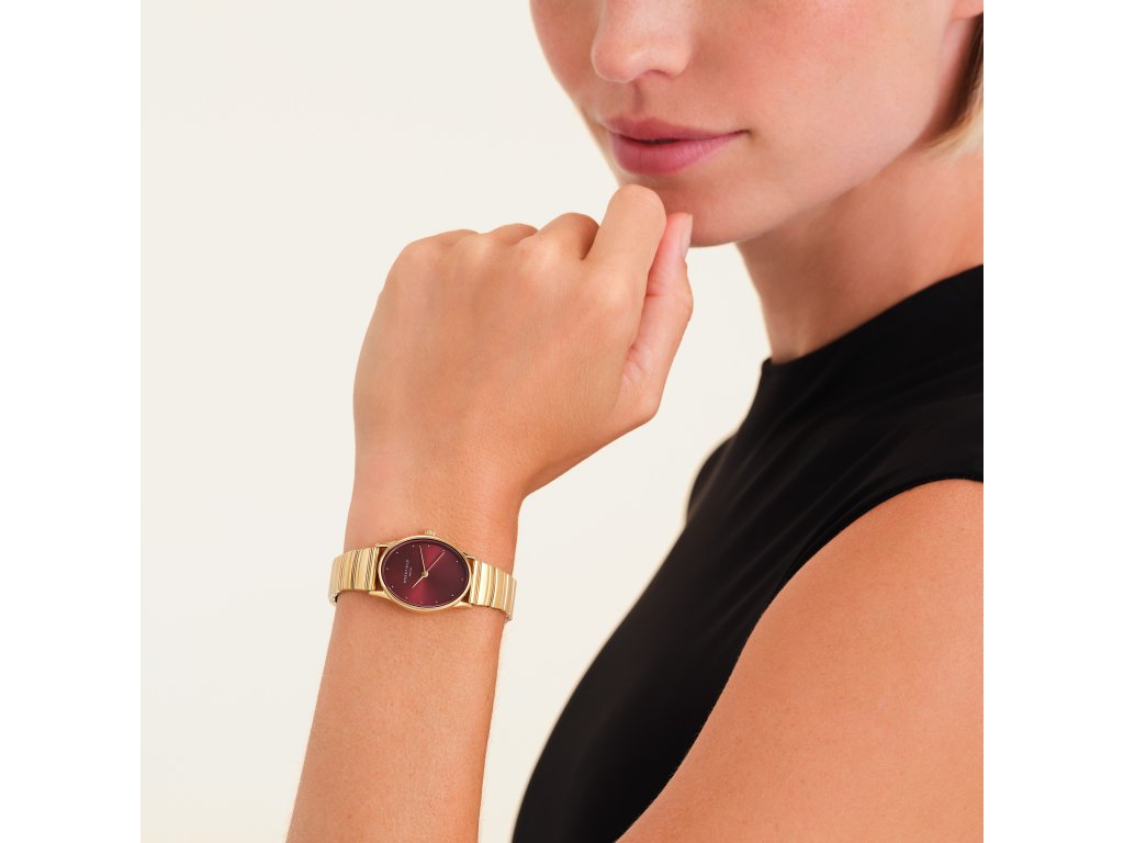 The oval gold-coloured case gives the model character and distinguishes it from classic square and round watches. The clean burgundy dial with no distracting elements promotes a minimalist look. The gold-tone steel bracelet matches the case and provides comfortable wear and a jewellery effect. Mineral glass protects the dial, and the quartz movement ensures accurate timekeeping.