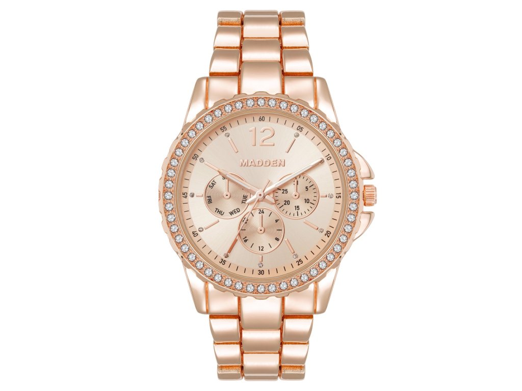 Ladies' watches from the Steve Madden brand combine subtle luxury, feminine elegance, and modern sparkle. The uniform rose gold color, complemented by crystals on the dial and case, creates the effect of a radiant piece of jewelry that will enhance any outfit and add a touch of subtle sophistication.
