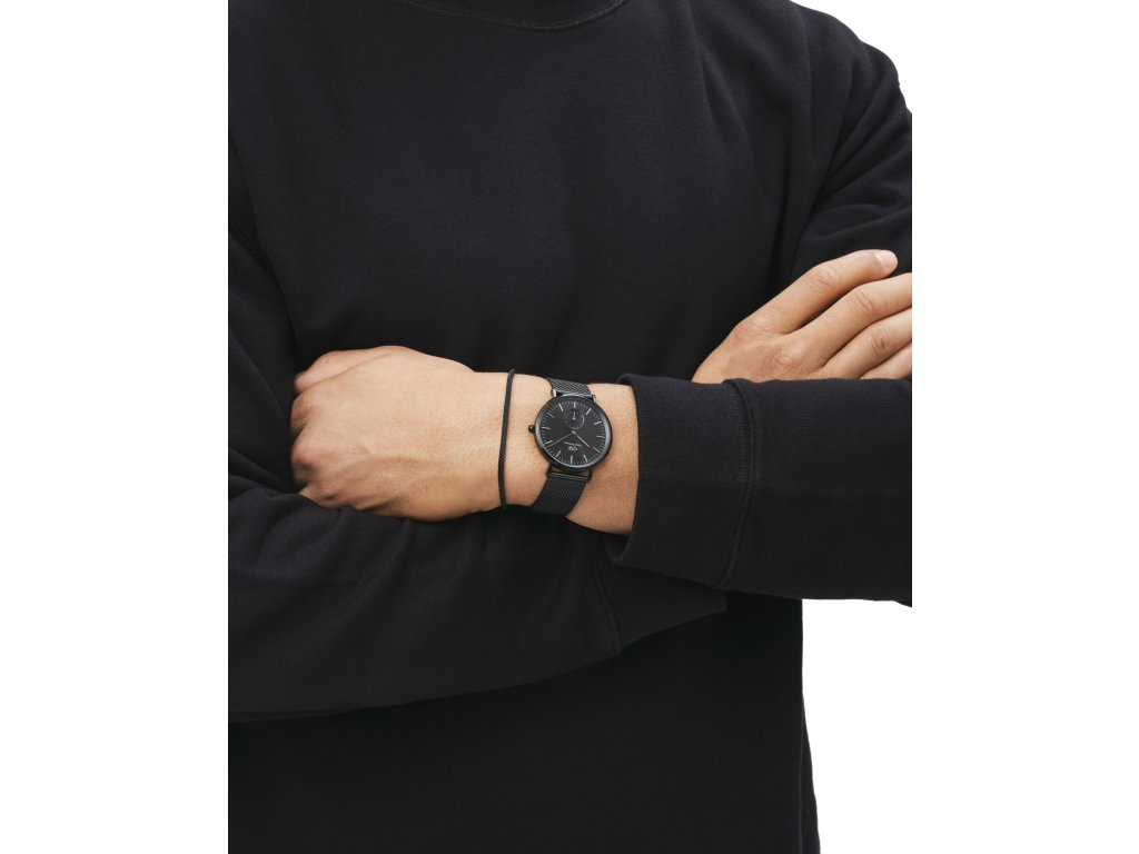 The black colour of the watch gives an impression of mysterious elegance that is hard to miss. A distinctive feature is the off-centre seconds hand, which is set into the mini dial, adding dynamism to the watch's appearance. The round case with a diameter of 40 mm is complemented by a fine stainless steel mesh pull in black. High-quality mineral glass provides protection against scratches.