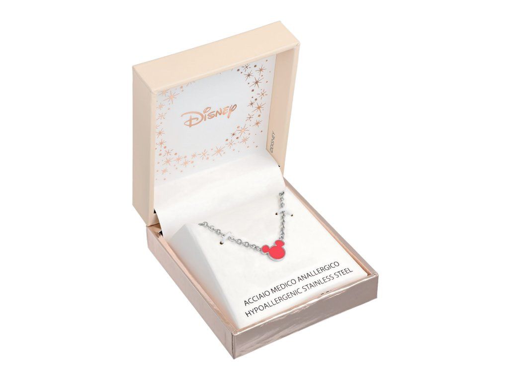 Kids' necklace with a Mickey Mouse head charm will delight all little lovers of iconic Disney motifs. Red enamel highlights the characteristic details and gives the jewelry a cheerful and playful look.