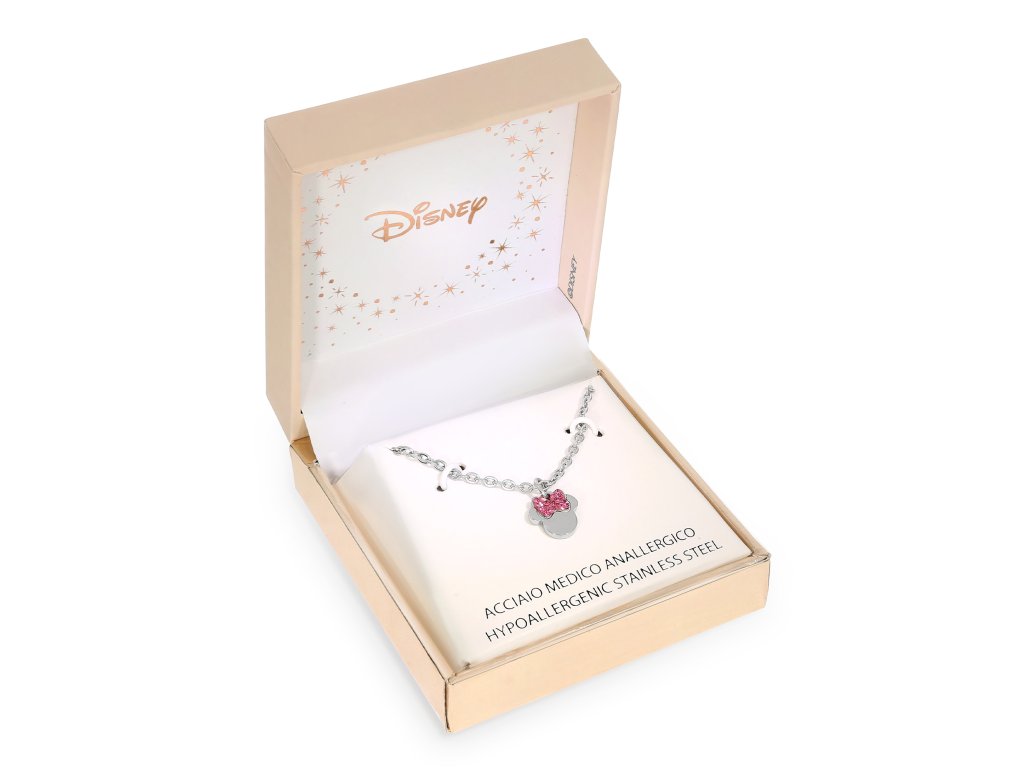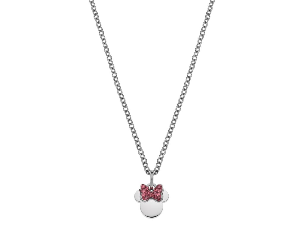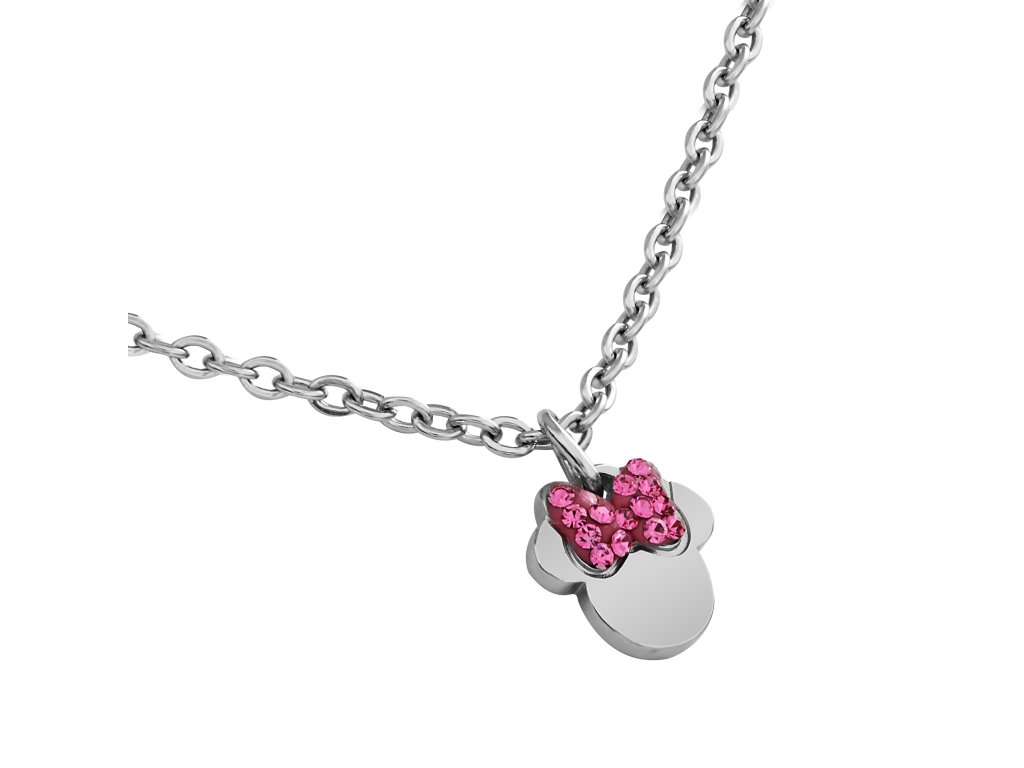 The necklace with pendant in the shape of the head of the Disney character Minnie Mouse is made of stainless steel with a shiny finish. The Minnie Mouse mask is decorated with fuchsia crystals, which give the jewel an extraordinary flair. The maximum length of the chain is 40 cm. It comes in a stylish box.