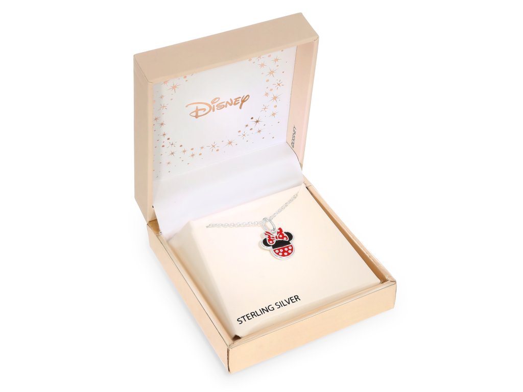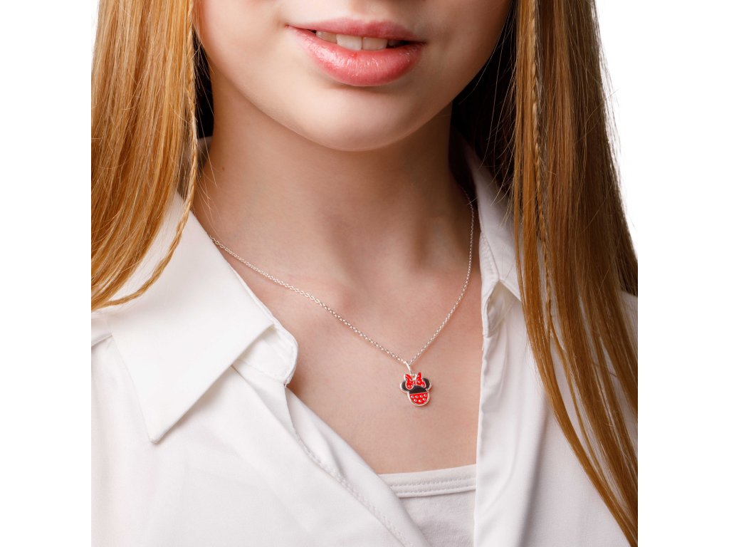 Jewellery is made of silver 925/1000. It is completed with a pendant in the shape of a Minnie Mouse head silhouette, which is decorated with red and black enamel.