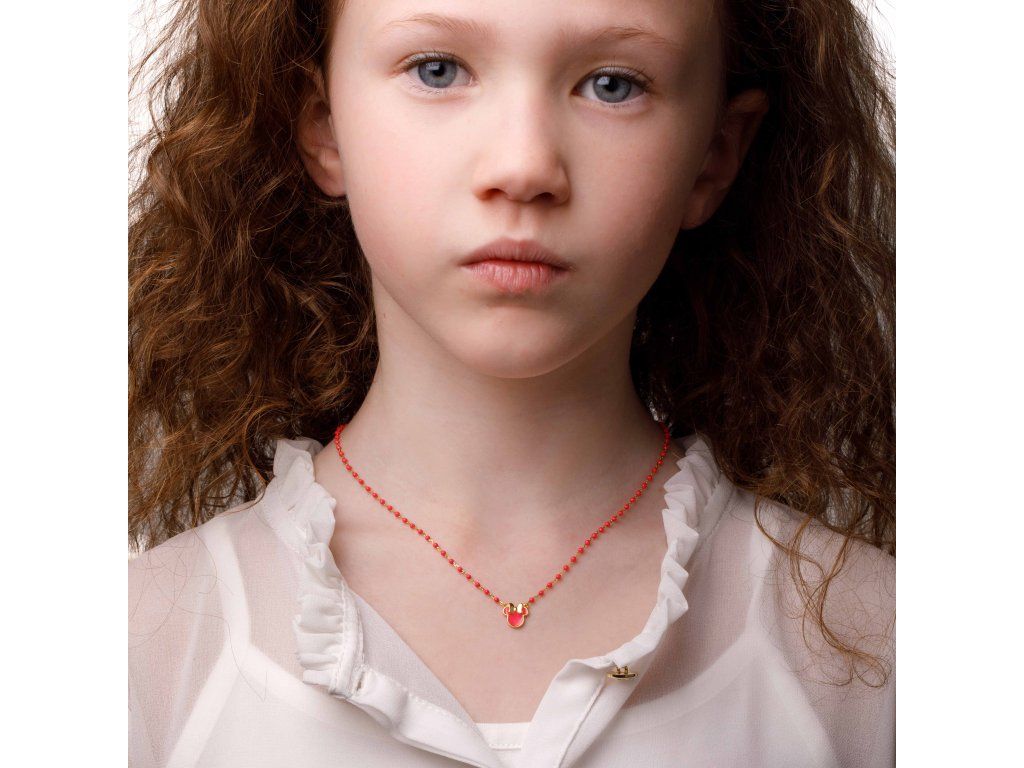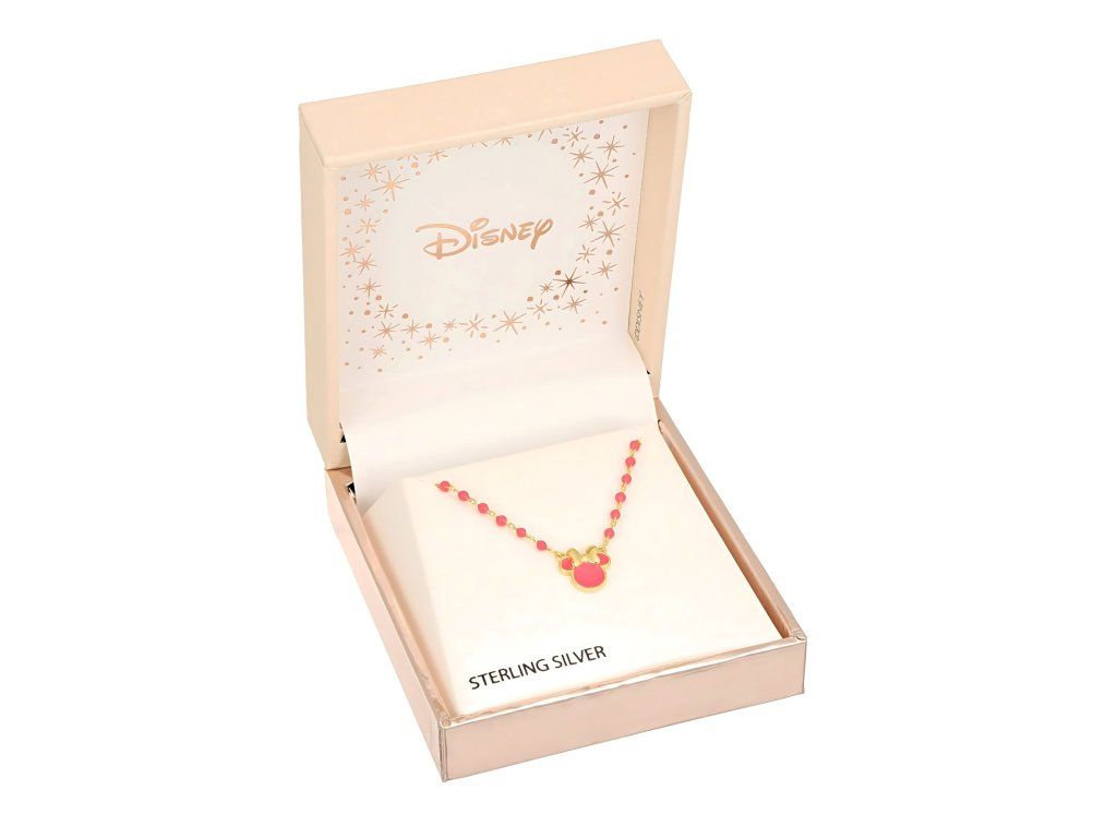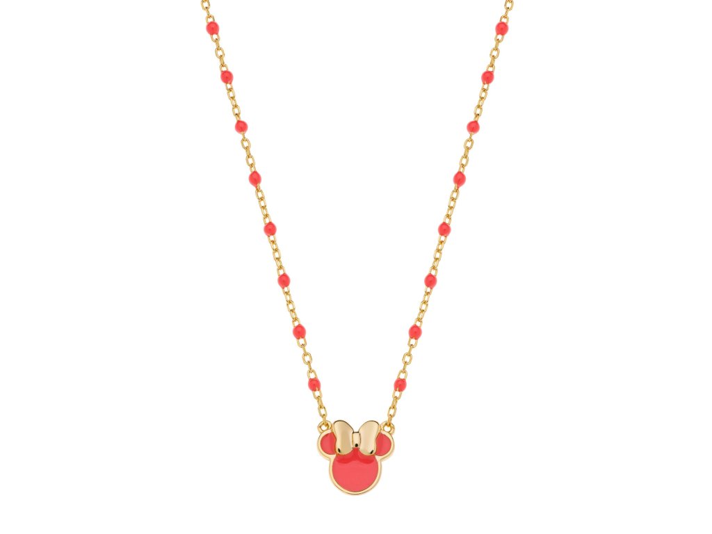 Gold-plated silver children's necklace with dark pink beads and a Minnie Mouse head charm will delight all little fans of the iconic Disney character. The dark pink enamel highlights the characteristic bow and perfectly complements the colourful beads.