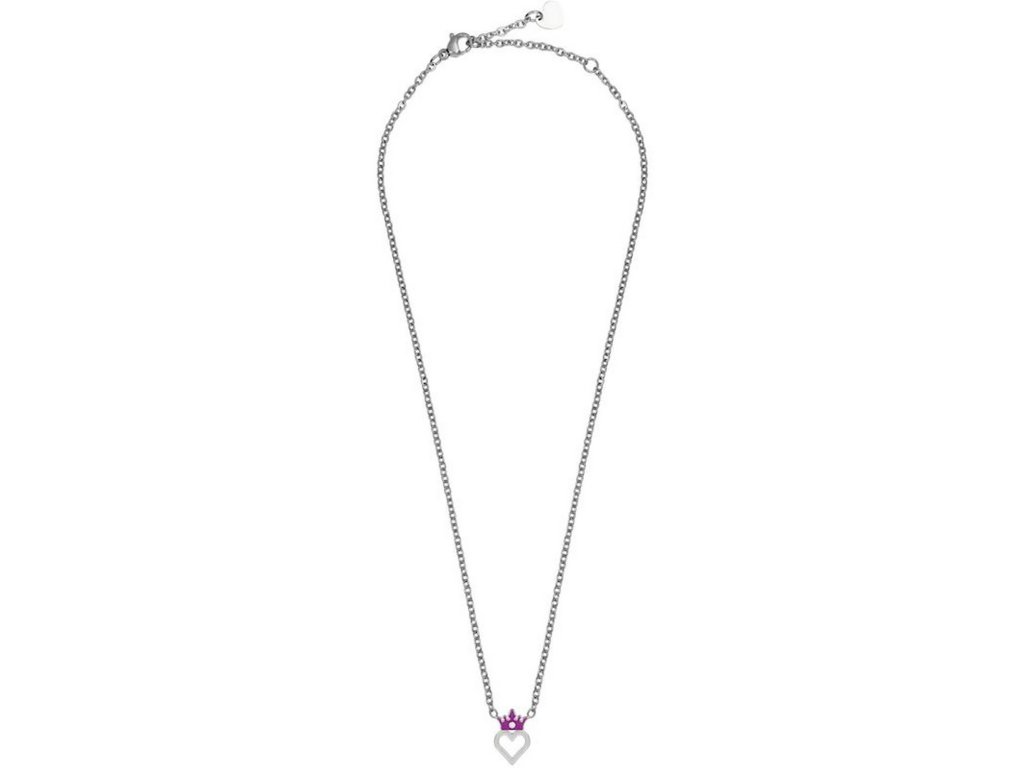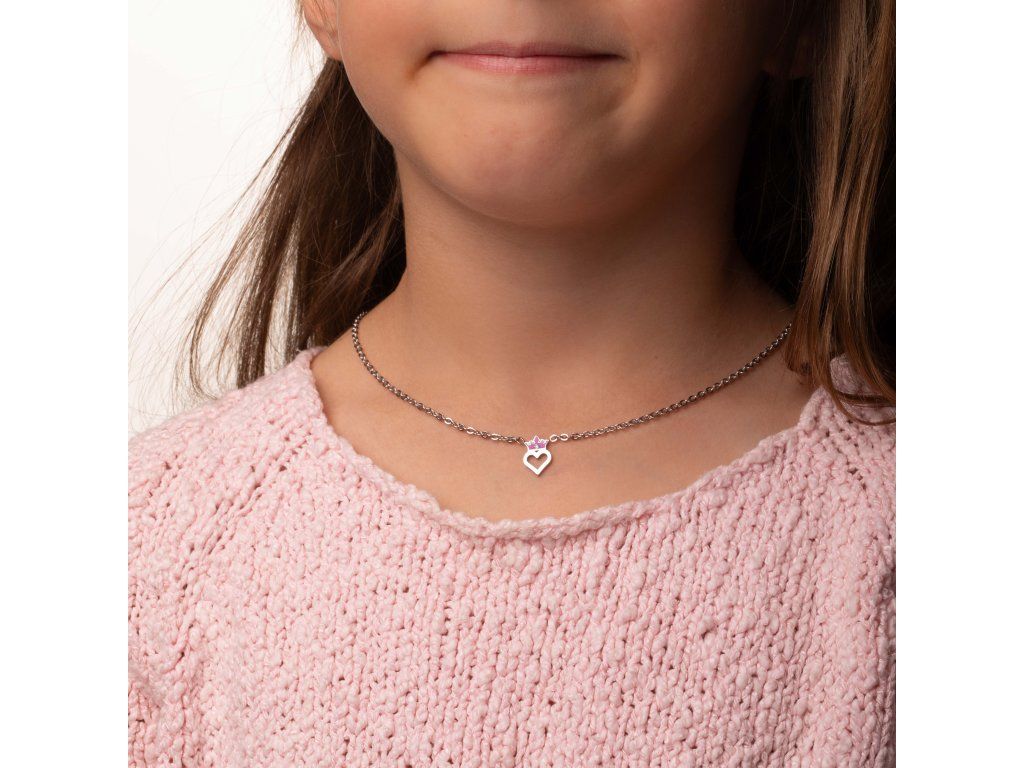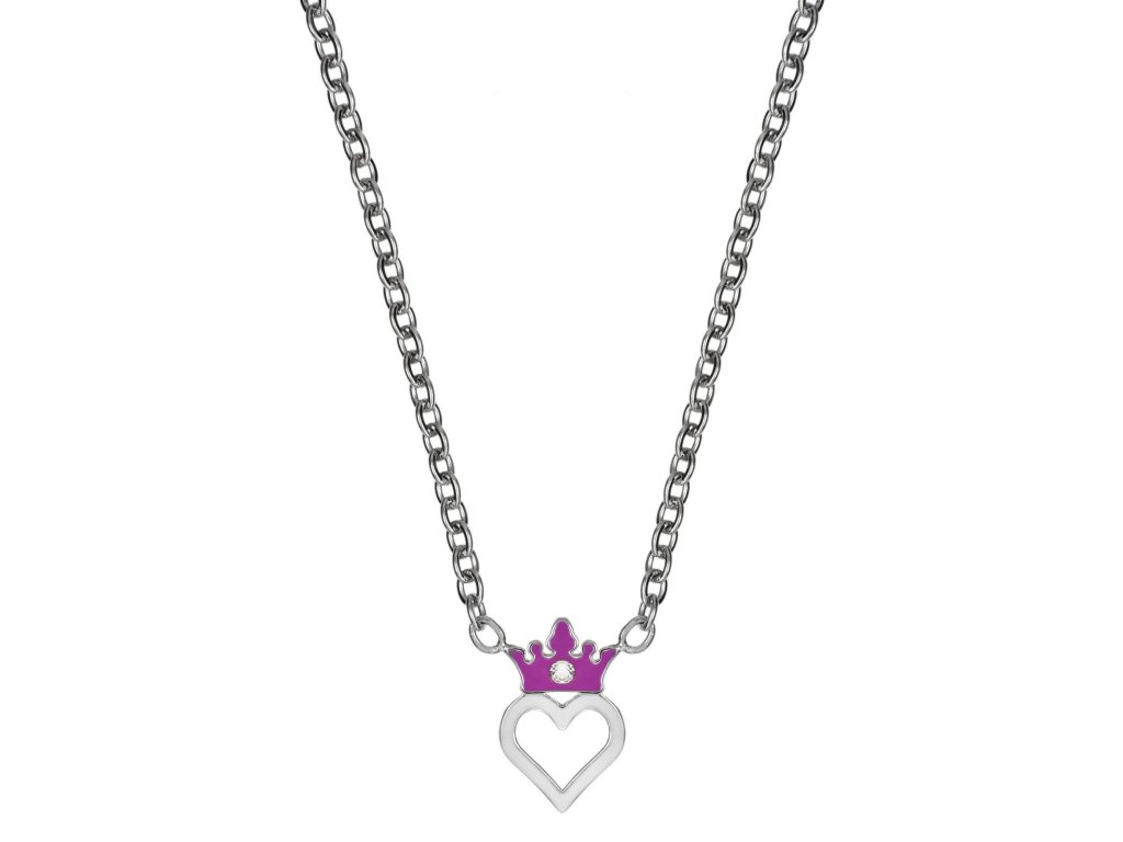 Children's necklace with a heart and crown charm will delight all little lovers of the magical world of Disney. Purple enamel gives the pendant a striking color accent, and the clear crystal enhances its delicate sparkle.