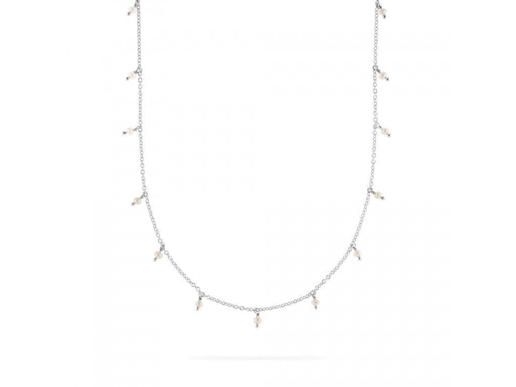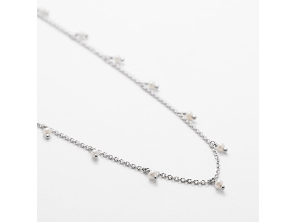 Seventeen white freshwater pearls are the main element of the necklace. It makes this 42 cm long jewel a magnificent accessory. They are finished with impressive silver coloured beads. The silver-plated pendants on which the pearls are suspended are attached to a necklace of tiny links made of sterling silver coated with rhodium to protect it from damage. Not to be overlooked is the small prism tastefully placed at the clasp, on which the brand name appears.