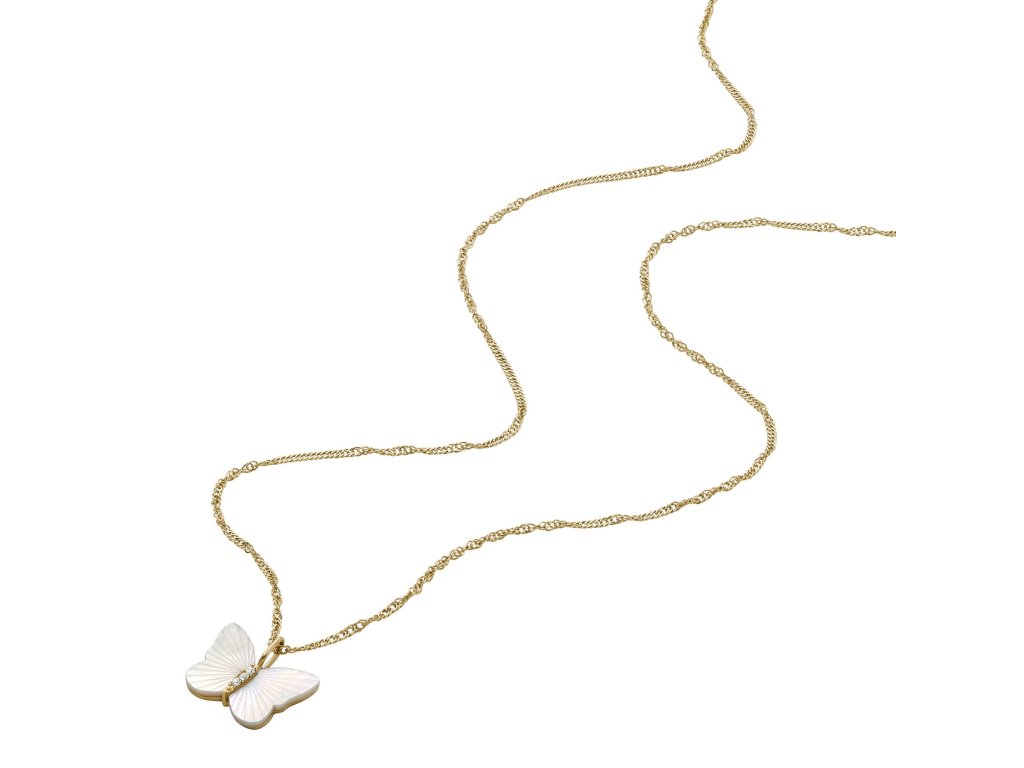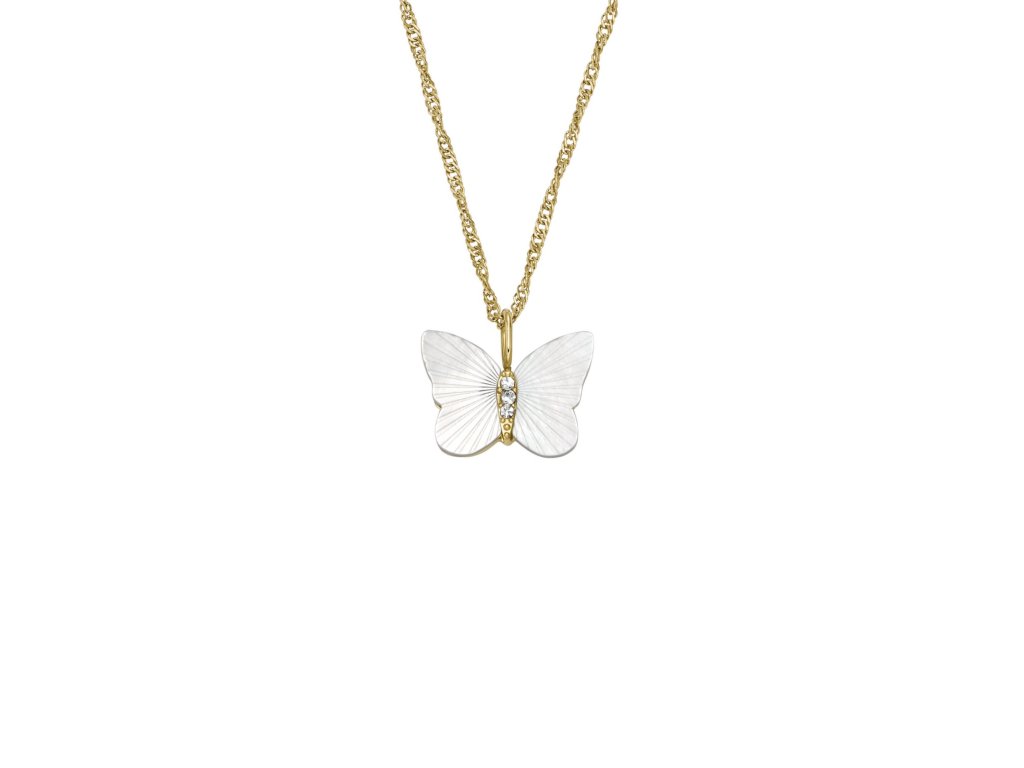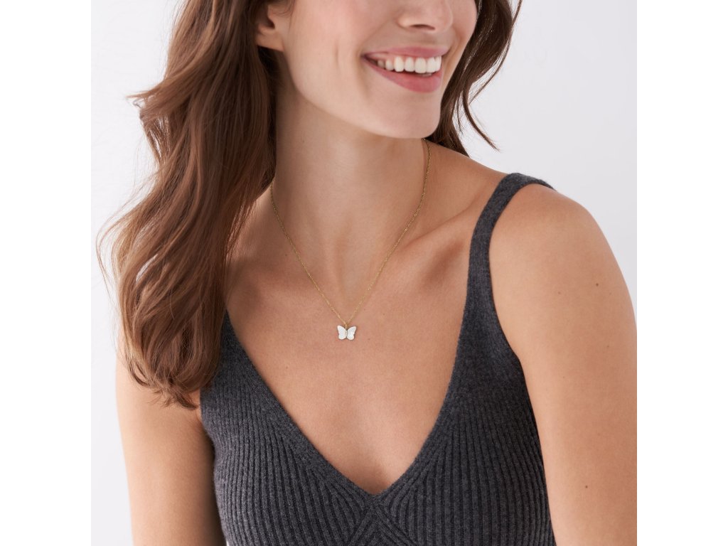 The necklace is made of high quality stainless steel with a gold finish that ensures durability and long-lasting shine. The butterfly motif is decorated with white mother-of-pearl and cubic zirconia crystals, which give it a luxurious touch. Thanks to the adjustable length, you can adjust the necklace to fit your outfit and style perfectly.