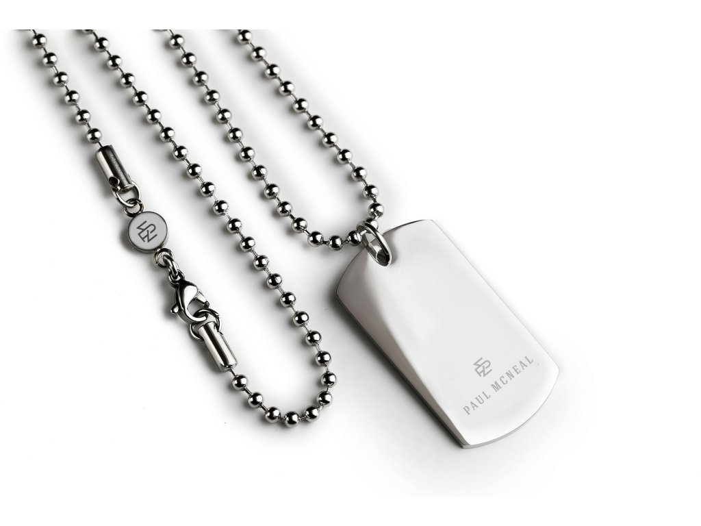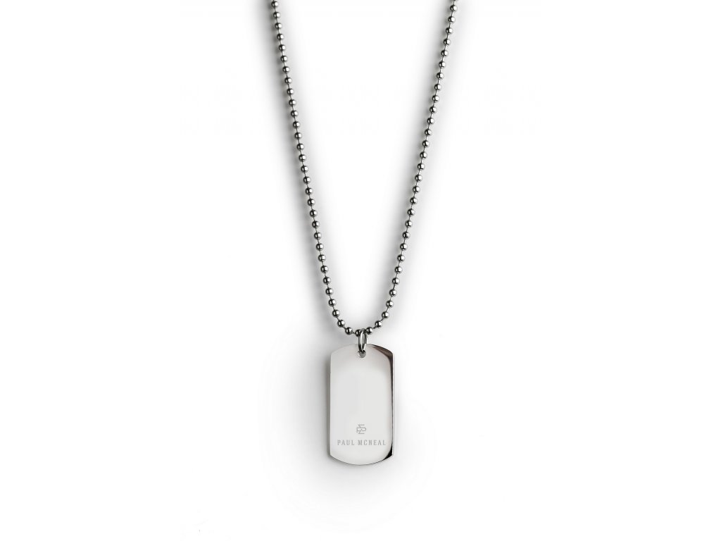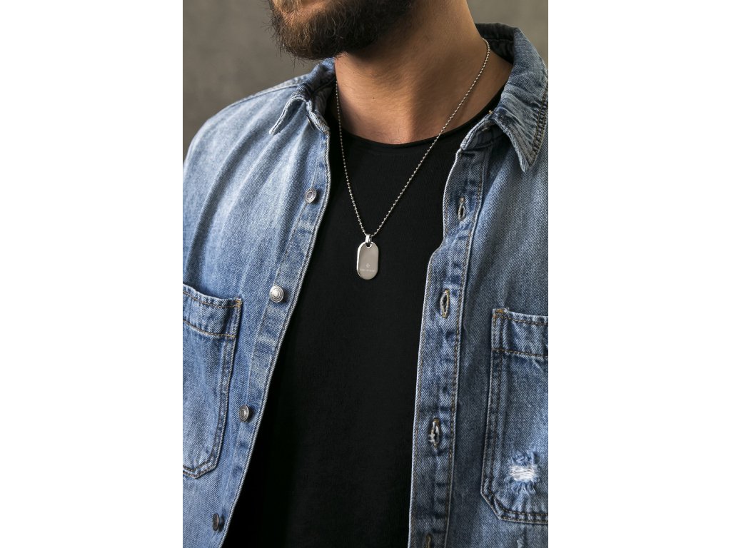 Steel ball necklace in silver with a pendant in the shape of a rounded plaque in silver and a classic clasp.Additional parameters
