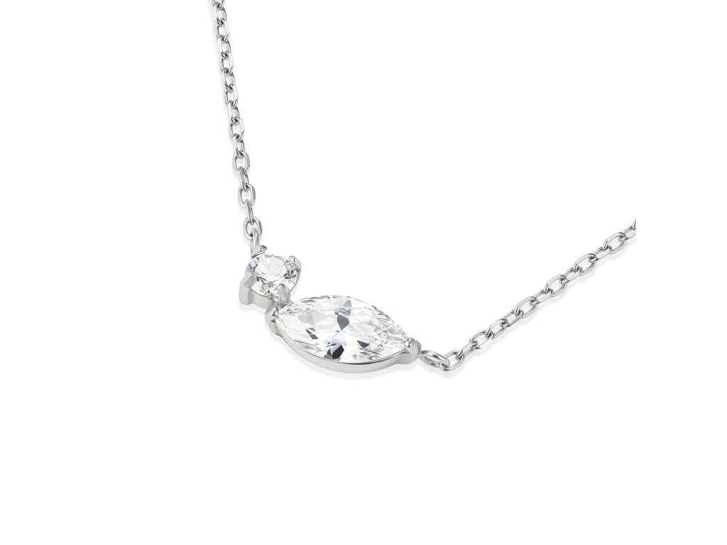 Precisely Cut Crystals catch the light with every movement, creating a subtle shimmering effect. Asymmetrically placed stones add a modern touch to the necklace, while rhodium-plated stainless steel ensures high durability, longevity, and a beautiful silver-toned shine.
