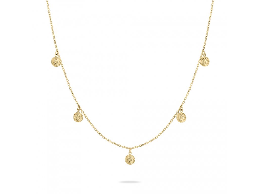 Modern ladies necklace from the German brand Tamaris contains several coin-shaped pendants with an antique finish.