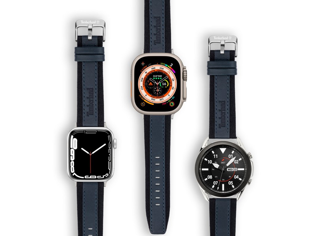 The universal Timberland Arnett strap stylishly combines dark blue leather and black ReBOLT material made from recycled PET bottles and is compatible with smart and classic analogue watches.
